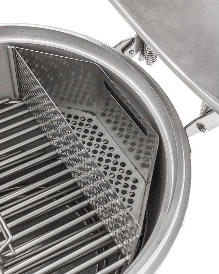 The charcoal basket sections off the charcoal to one side of the grill for indirect cooking and greater control. When paired with the Blaze Kamado Rotisserie the hot charcoal in the basket provides infrared heat which results in food that retains more of its own natural flavor. The moisture-enhancing pan fits perfectly with or without the charcoal basket to catch all of those delicious juices for pan sauces and gravies or can be used as a moisture pan for water or any of your favorite cooking liquids when smoking. The Blaze Easy Light Indirect Cooking System with Moisture Enhancing Pan is warranted for 1 year to the original owner against defects in manufacturing and workmanship. This warranty extends to the original purchaser against manufacture defects for products purchased for ordinary single-family home use.