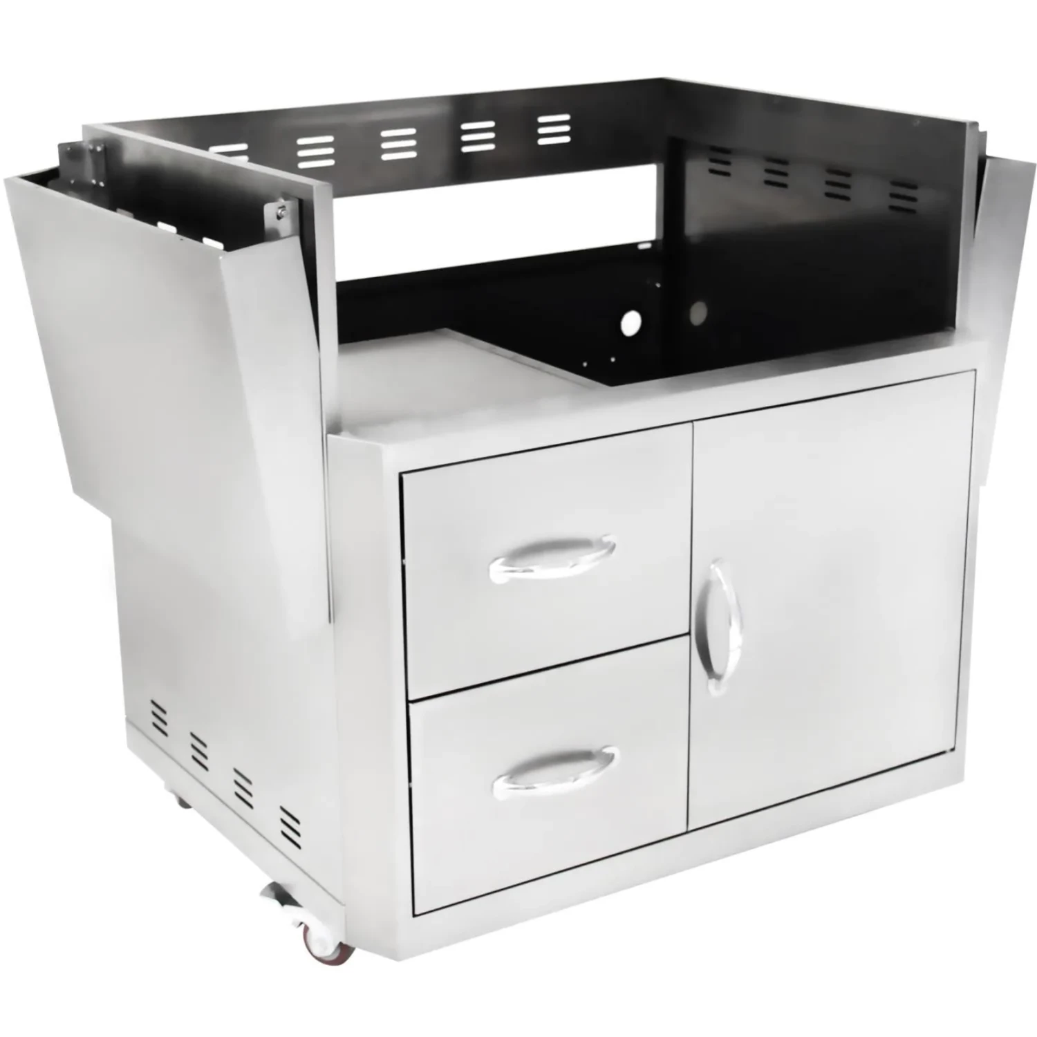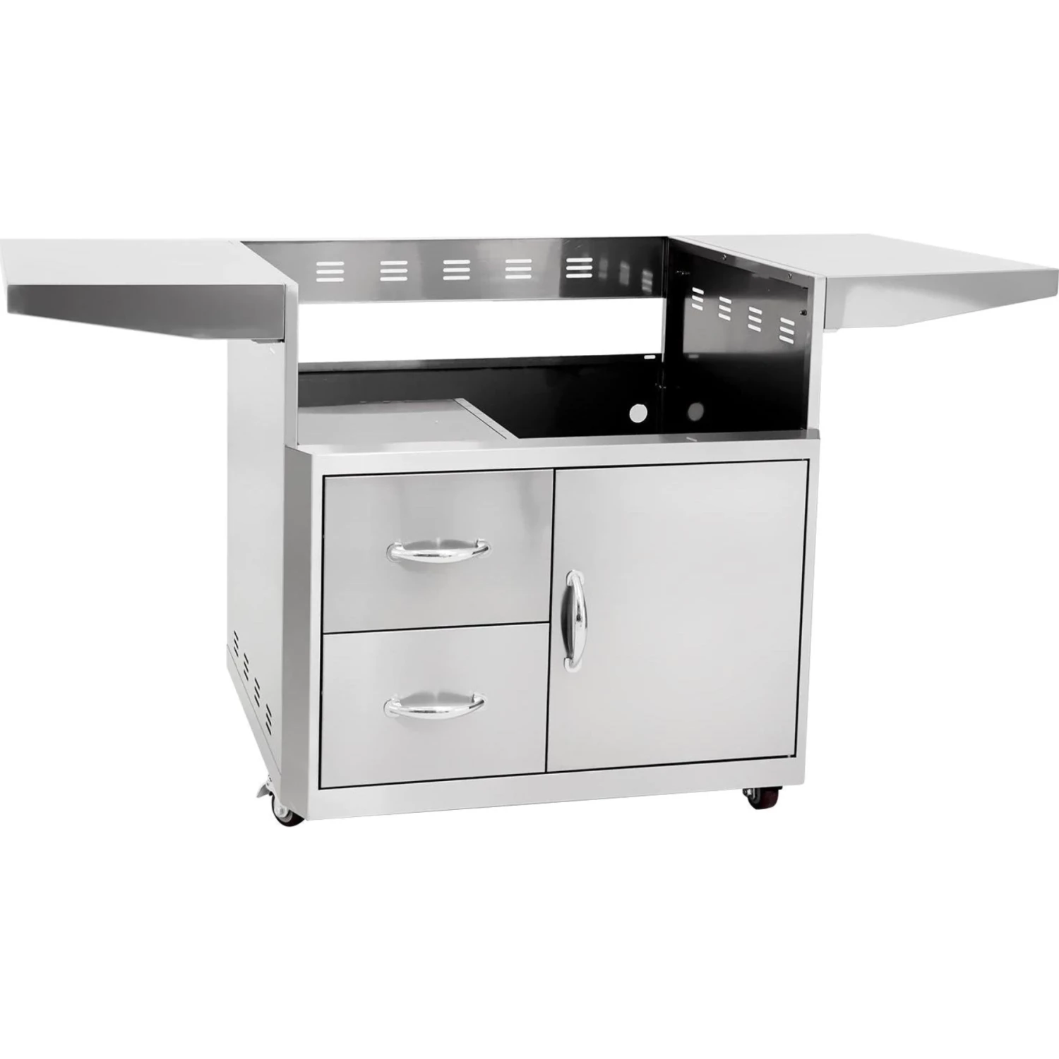 The finest in outdoor cooking just got better with high-performance, industry-leading heavy-gauge materials and commercial quality craftsmanship in the Blaze Professional LUX. This all stainless steel grill cart is specifically designed to house the Blaze Professional LUX 3-burner gas grill and matches the sleek contours of the grill. The stainless steel construction ensures long-lasting durability for years of outdoor use and the four heavy-duty, locking wheels allow you to easily relocate the grill whenever necessary. The two stainless steel side shelves keep your BBQ tools at hand, provide a convenient work area while you cook, and fold down to save space while not in use. The Blaze Professional LUX grill cart also features two drawers and one door, all with rounded handles, to store your propane tank and BBQ accessories.