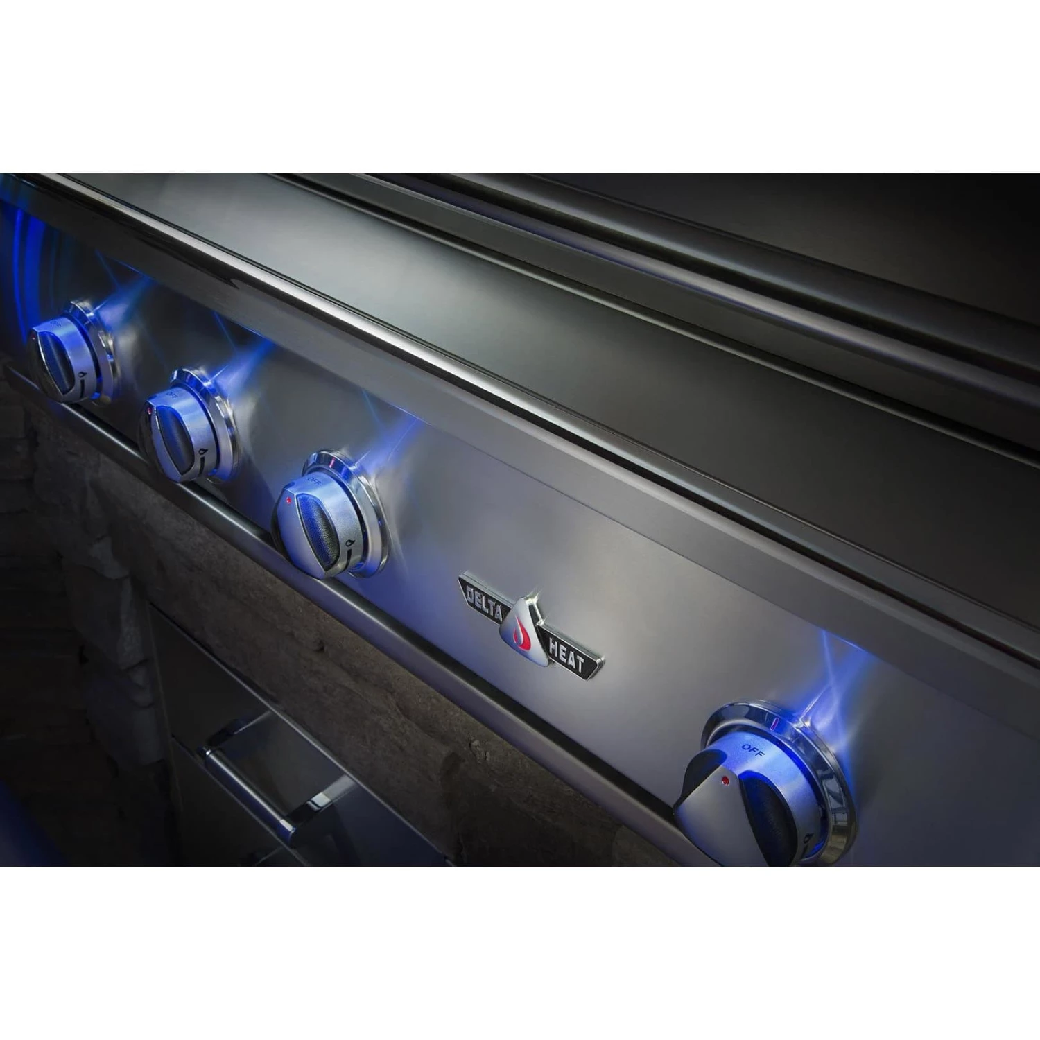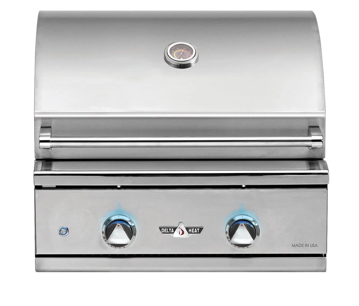 This Delta Heat gas grill brings exceptional quality and performance to any outdoor kitchen. Delta Heat gas grills feature 304 stainless steel with seamless welded construction, sleek high-polished accents, and a double-lined hood for maximum strength, durability, and appeal to your entertaining experience. This 26-inch grill has two (2) 18 gauge stainless steel U-Burners, ceramic briquette flame tamers that distribute the radiant heat more evenly across the cooking surface, and stainless steel cooking grates. Decorative blue LED lights to illuminate the control knobs turning your grill into the main attraction and the interior halogen lights illuminate the 420 square inches of main cooking surface for entertaining at night. The grill has 139 square inches of secondary cooking with an adjustable warming rack. Delta Heat products are designed and manufactured in the USA with pride.