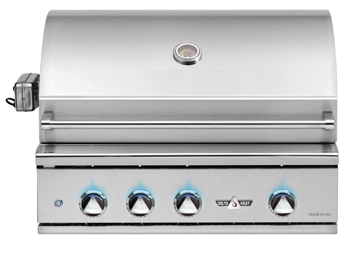This Delta Heat gas grill brings exceptional quality and performance to any outdoor kitchen. Delta Heat gas grills feature 304 stainless steel with seamless welded construction, sleek high-polished accents, and a double-lined hood for maximum strength, durability, and appeal to your entertaining experience. This 32-inch grill has three (3) 18 gauge stainless steel U-Burners, ceramic briquette flame tamers that distribute the radiant heat more evenly across the cooking surface, and stainless steel cooking grates. Decorative blue LED lights to illuminate the control knobs turning your grill into the main attraction and the interior halogen lights illuminate the 525 square inches of main cooking surface for entertaining at night. The grill has 174 square inches of secondary cooking with an adjustable warming rack. Delta Heat products are designed and manufactured in the USA with pride
