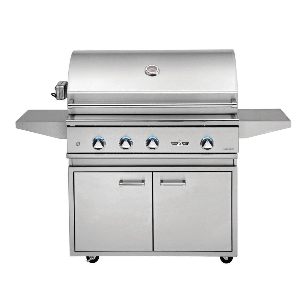This Delta Heat freestanding gas grill brings exceptional quality and performance to any outdoor oasis. Delta Heat gas grills feature 304 stainless steel with seamless welded construction, sleek high-polished accents, and a double-lined hood for maximum strength, durability, and appeal to your entertaining experience. This 38-inch grill has three (3) 18 gauge stainless steel U-Burners, ceramic briquette flame tamers that distribute the radiant heat more evenly across the cooking surface, and stainless steel cooking grates. Decorative blue LED lights to illuminate the control knobs turning your grill into the main attraction and the interior halogen lights illuminate the 625 square inches of main cooking surface for entertaining at night. The grill has 210 square inches of secondary cooking with an adjustable warming rack. The stainless steel grill cart matches the sleek professional style of the Delta Heat product line. The cart features four heavy-duty swivel casters with two (2) locking brakes allowing you to relocate and secure the grill whenever necessary and two (2) stationary stainless steel side shelves with utensil hooks that provide an optimum work area while you cook. This cart has two (2) stainless steel access doors that can be removed and used for a built-in application should your outdoor entertaining needs change. Delta Heat products are designed and manufactured in the USA with pride.