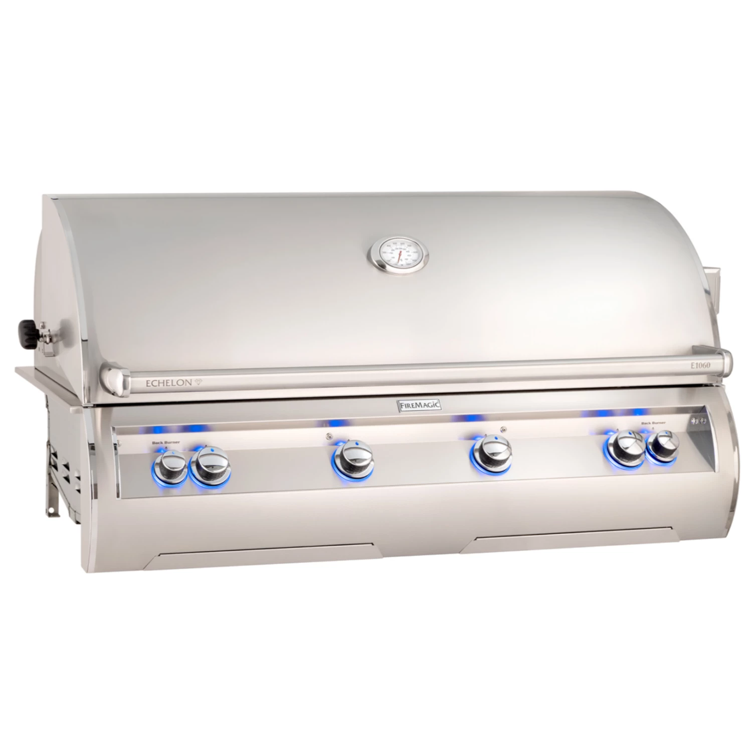 Known for crafting American-made premium grills for over 75 years, Fire Magic is dedicated to providing its customers with a quality outdoor cooking experience. Nowhere is this more evident than with the Echelon Diamond series, which embodies performance, beauty, and innovation in grilling. The Echelon Diamond E1060I built-in gas grill features 304 stainless steel construction for lasting quality and modern styling with an analog thermometer. The double-walled, spring-assisted hood opens 90 degrees for easier access and more efficient exhaust. Inside, this grill features four cast stainless steel natural gas E-burners, made with 1/4-inch thick walls and precision porting, that combine for 112,000 BTUs. Reliable hot surface ignition always lights your burners where others might fail. Flash tubes serve as a backup. Flavor grids sit above the burners to spread heat evenly and protect the burners from debris and grease. These flavor grids have attached heat zone separators, allowing you to create independent heat zones at the surface of the grill for varied cooking options. The 1056 sq. in. cooking surface consists of the patented Diamond Sear cooking grids. These grids feature a matte, non-stick surface, and a trapezoidal shape that optimally transfers heat from the burner to the wide surface of the cooking grids. The warming rack above can be adjusted and moved out of the way when not in use. In the rear of the grill are two Quantum stainless steel infrared backburners for the included heavy-duty rotisserie kit that work together to produce 22,000 BTUs. These burners use stainless steel foam, which provides double the heat per BTU. Additionally, Echelon Diamond grills come with a charcoal/smoker basket for adding a delicious, smoky flavor to your cook. For nighttime grilling, the interior of the grill is lit by three halogen lights. A new, larger drip tray with ball-bearing glides makes cleanup with the disposable drip pan system even easier than before. Solid, raised hangers line the sides and back of the grill for a seamless look when placed into a countertop or island. A 120 VAC power source is required for ignition, as well as for the lighting functions. With all of these premium features, the Echelon Diamond series from Fire Magic defines luxury grilling.