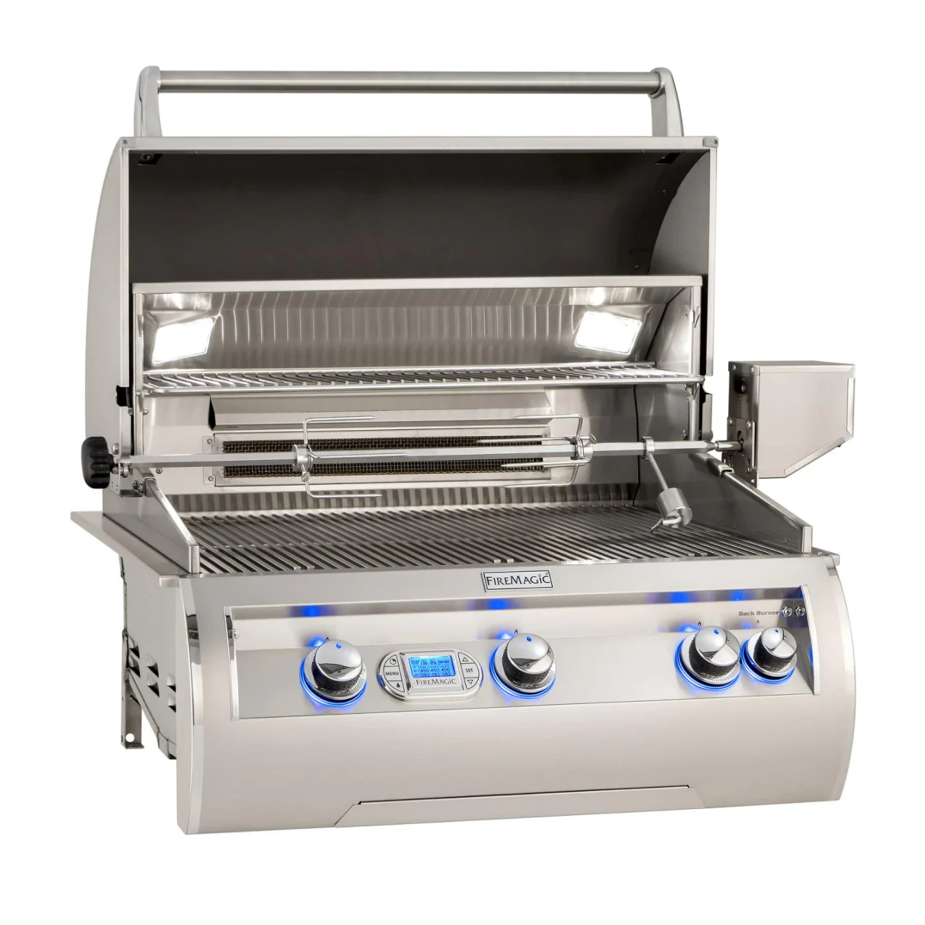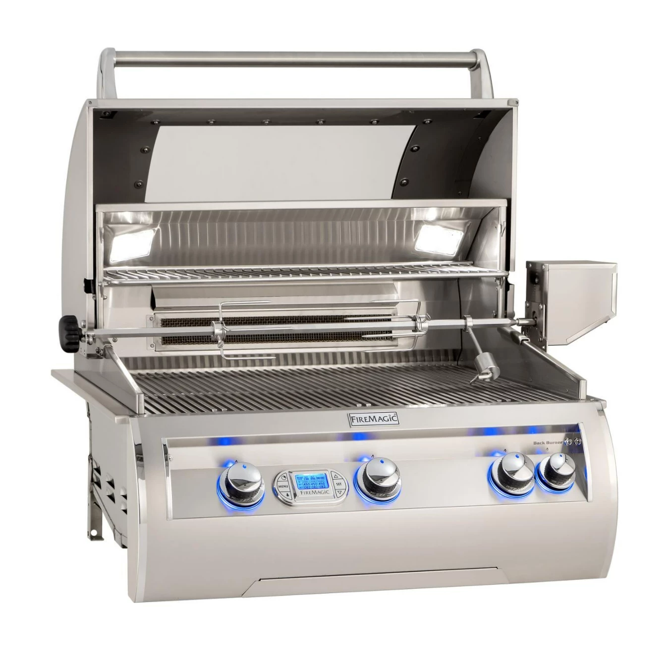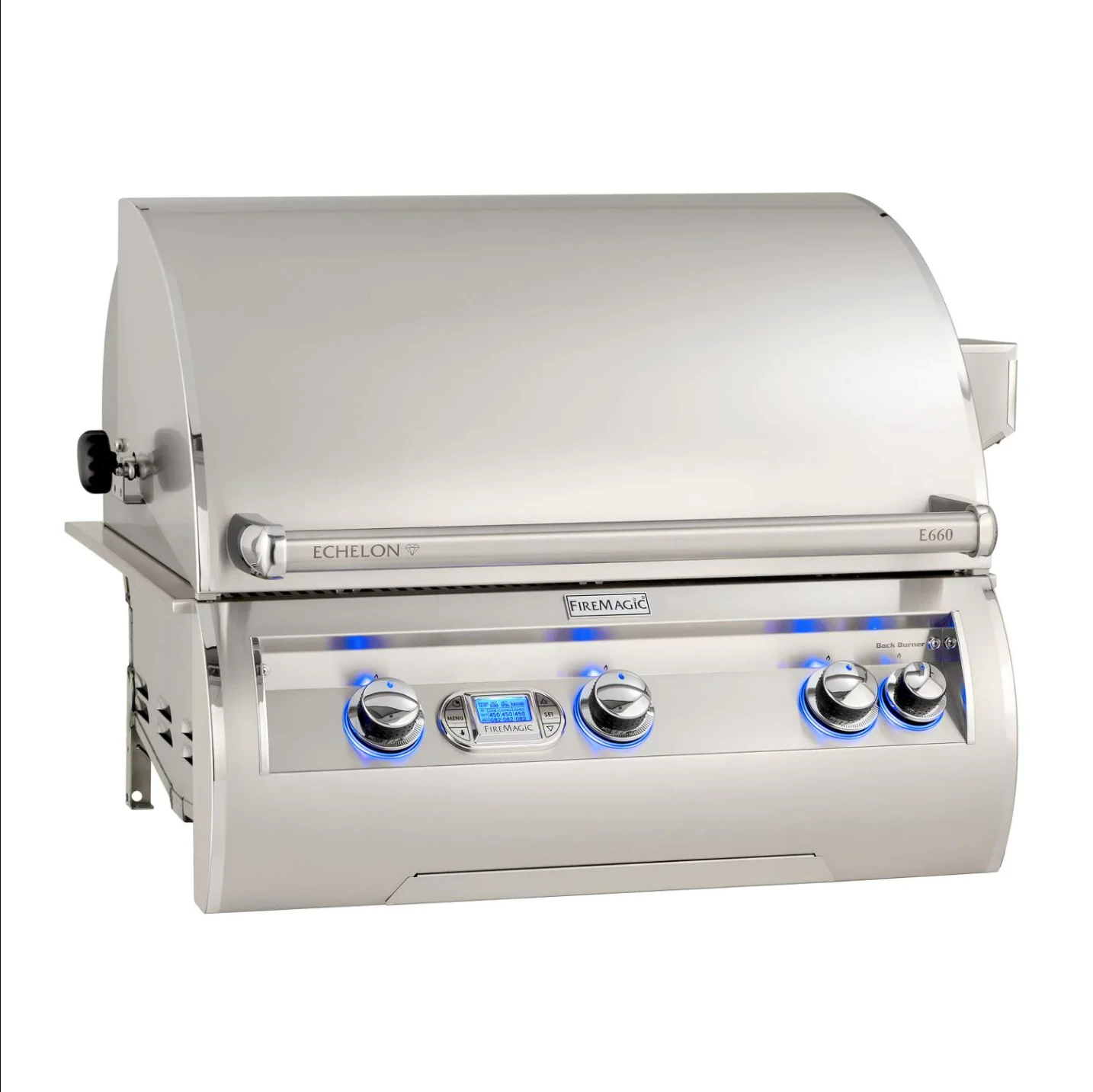 Known for crafting American-made premium grills for over 75 years, Fire Magic is dedicated to providing its customers with a quality outdoor cooking experience. Nowhere is this more evident than with the Echelon Diamond series, which embodies performance, beauty, and innovation in grilling. The Echelon Diamond E660I built-in natural gas grill features 304 stainless steel construction for lasting quality, and modern styling with a sleek, contoured control panel that includes LED-backlit comfort touch knobs and a state-of-the-art digital thermometer display. This display has a 4 zone temperature reading and can be used to monitor the included food probe. With finger touch controls, you can set temperatures, monitor cooking time, switch the internal lights on or off, and even choose between 4 colors for the display. The double-walled, spring-assisted hood opens 90 degrees for easier access and more efficient exhaust. Inside, this grill features two cast stainless steel E-burners, made with 1/4-inch thick walls and precision porting, and a left side infrared burner that combine for 75,000 BTUs. Reliable hot surface ignition always lights your burners where others might fail. Flash tubes serve as a backup. Flavor grids sit above the burners to spread heat evenly and protect the burners from debris and grease. These flavor grids have attached heat zone separators, allowing you to create independent heat zones at the surface of the grill for varied cooking options. The 660 sq. in. cooking surface consists of the patented Diamond Sear cooking grids. These grids feature a matte, non-stick surface, and a trapezoidal shape that optimally transfers heat from the burner to the wide surface of the cooking grids. The warming rack above can be adjusted and moved out of the way when not in use. In the rear of the grill is a Quantum stainless steel infrared backburner for the included heavy-duty rotisserie kit that produces 11,000 BTUs of radiant heat. This burner uses stainless steel foam, which provides double the heat per BTU. Additionally, Echelon Diamond grills come with a charcoal/smoker basket for adding a delicious, smoky flavor to your cook. For nighttime grilling, the interior of the grill is lit by two halogen lights. A new, larger drip tray with ball-bearing glides makes cleanup with the disposable drip pan system even easier than before. Solid, raised hangers line the sides and back of the grill for a seamless look when placed into a countertop or island. A 120 VAC power source is required for ignition, as well as for the lighting functions. With all of these premium features, the Echelon Diamond series from Fire Magic defines luxury grilling.