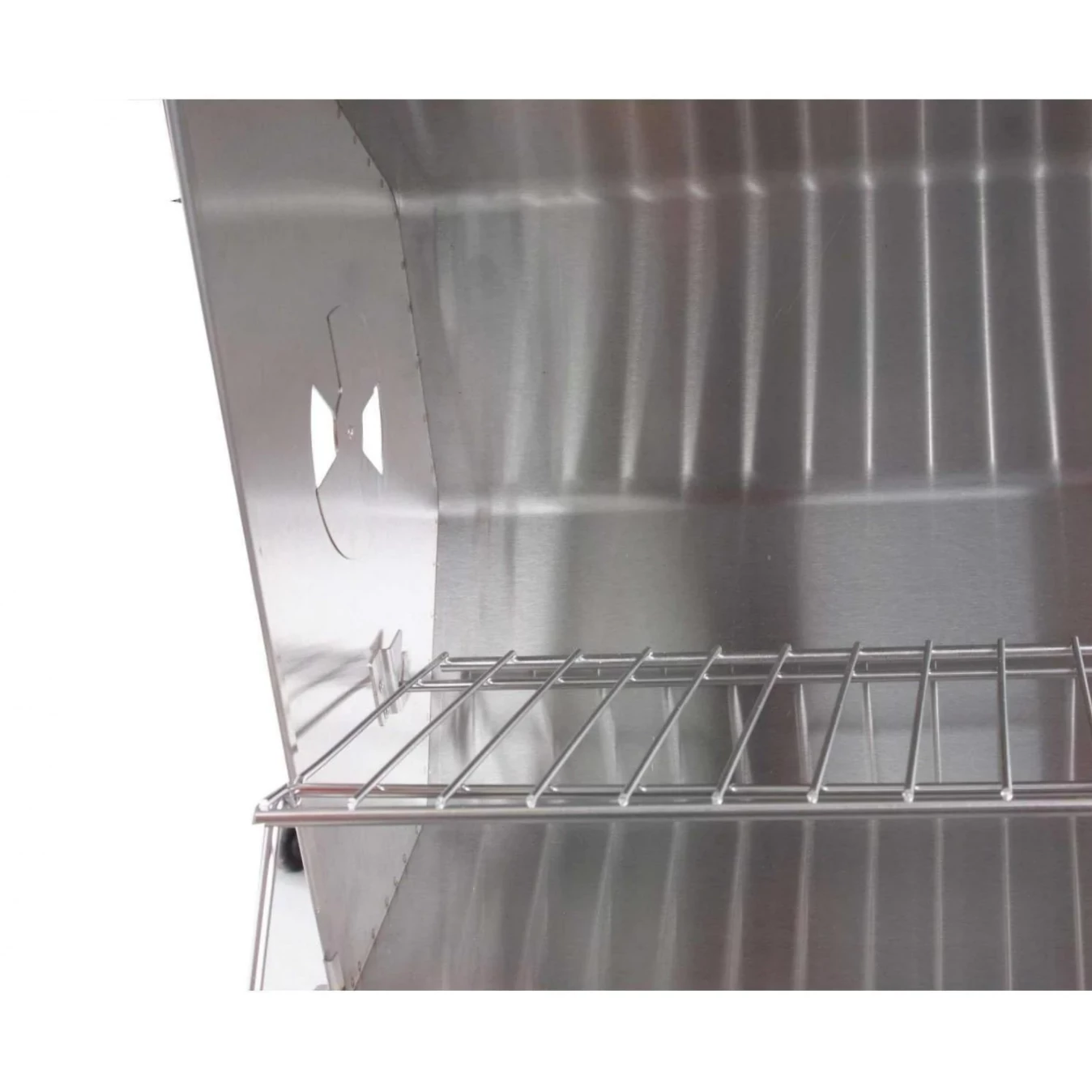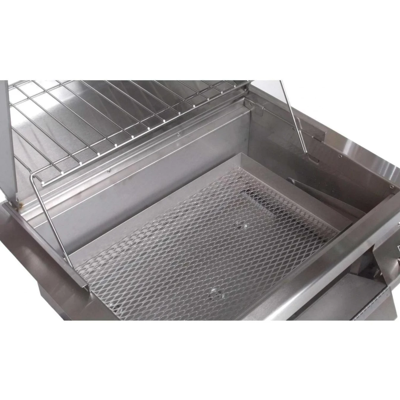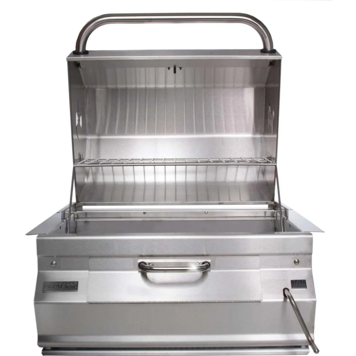 The Fire Magic 30 Inch Charcoal Grill features a 540 square inch cooking surface, all stainless steel construction, and a heavy-duty stainless smoker hood with a precise analog thermometer. The smoker hood features adjustable air shutters for easy temperature control. The adjustable cooking surface and easy-access charcoal drawer make adding charcoal and smoker chips a breeze. The smoker includes a charcoal shield for indirect cooking and a warming rack. Allow 10-12 inches from the back of the grill to the backsplash/wall for lid clearance when the lid is open.