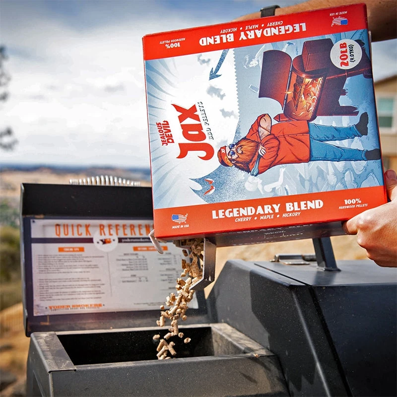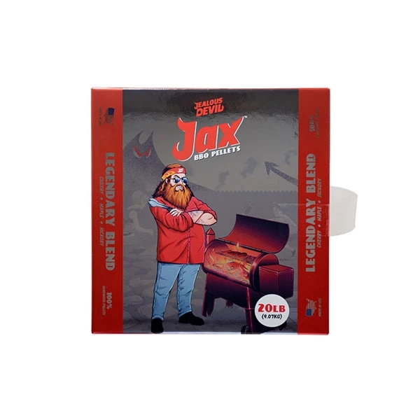 Jealous Devil Jax Hardwood BBQ Pellets never compromise on quality. Proudly crafted in their company-owned facility in the USA. Only select, virgin, bark-free hardwoods are used in our formulations, ensuring flavor, performance, and low-ash content. All of this in a gorgeous weather-resistant box with a built-in resealable pour spout. These pellets are made from a legendary blend of cherry, maple, and hickory hardwoods. Jax BBQ Pellets are 100% natural with no fillers, binders, or additives. The quality and consistency guaranteed – all Jax Pellets exceed PFI (Pellet Fuels Institute) standards.