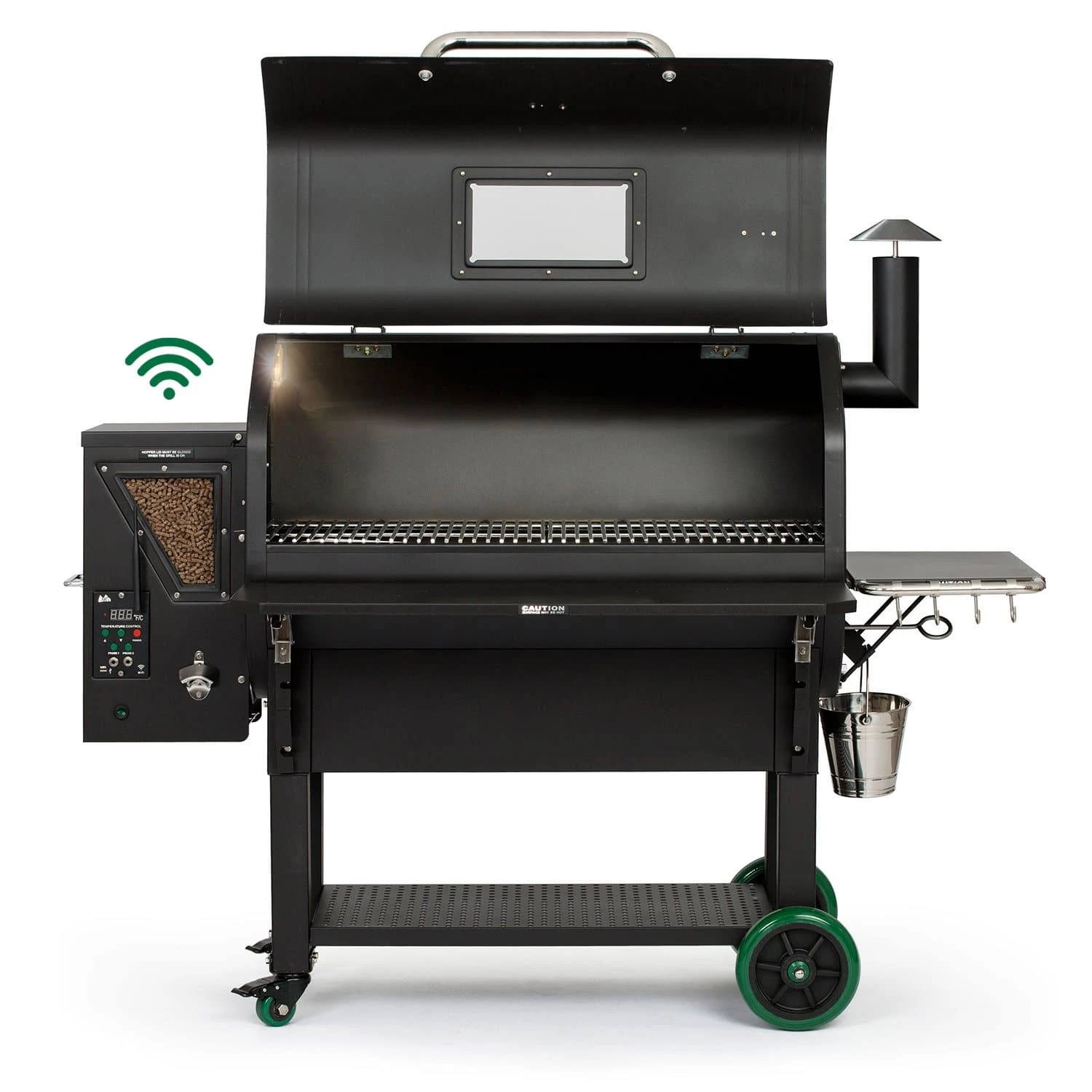 The Jim Bowie Prime+ model comes with a redesigned digital controller that allows you to control and monitor your grill through our iOS or Android mobile application, dual meat probes, and a USB port. With the new grill and pellet view windows, you can keep an eye on your food without letting smoke/heat escape and see your pellet supply. Our 13.5 in. peaked lid provides enough space for a stand-up chicken to a dozen racks of ribs. Keep all of your grilling tools handy by hanging them on the utensils hooks of your side convenience tray. All of our grills have a venturi-style firebox that creates a cyclone flame that ensures maximum combustion. They also have Sense-Mate, a thermal sensor that constantly monitors the ambient temperature. When the weather gets cold, the sensor kicks the grill into Turbo Mode, so you don’t have to wait long for the grill to heat up! Other features include Keep Warm Mode and Fan the Only Mode with automatic shut-off to blow ash out of the firebox after you finish grilling.