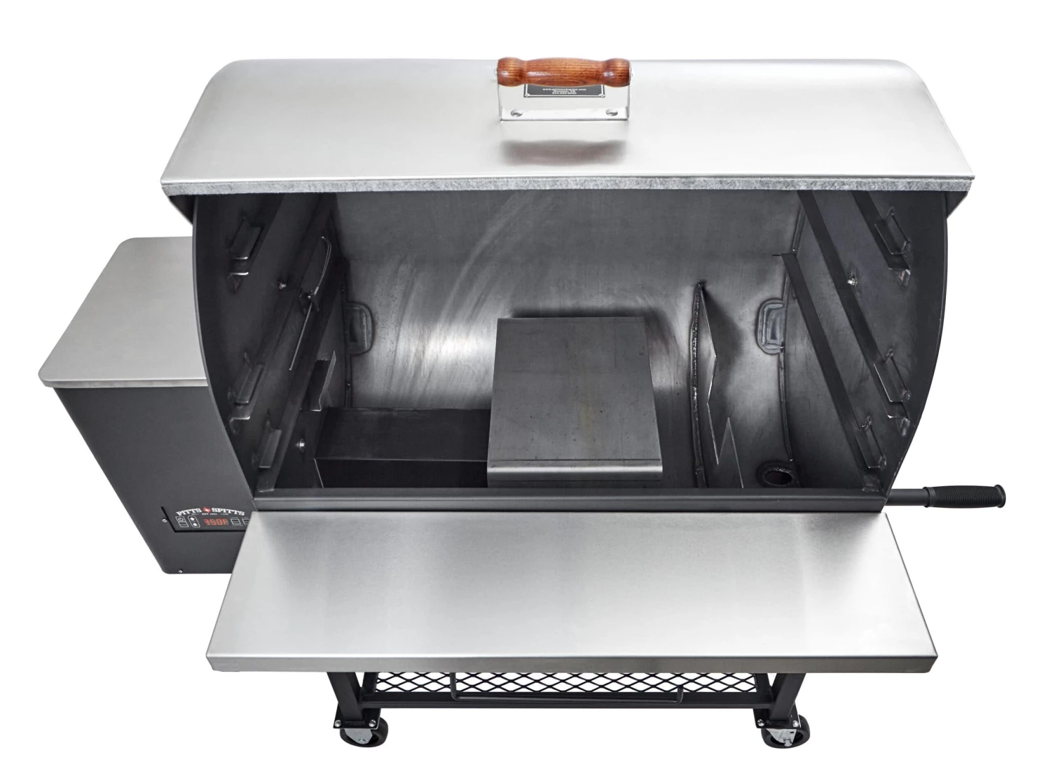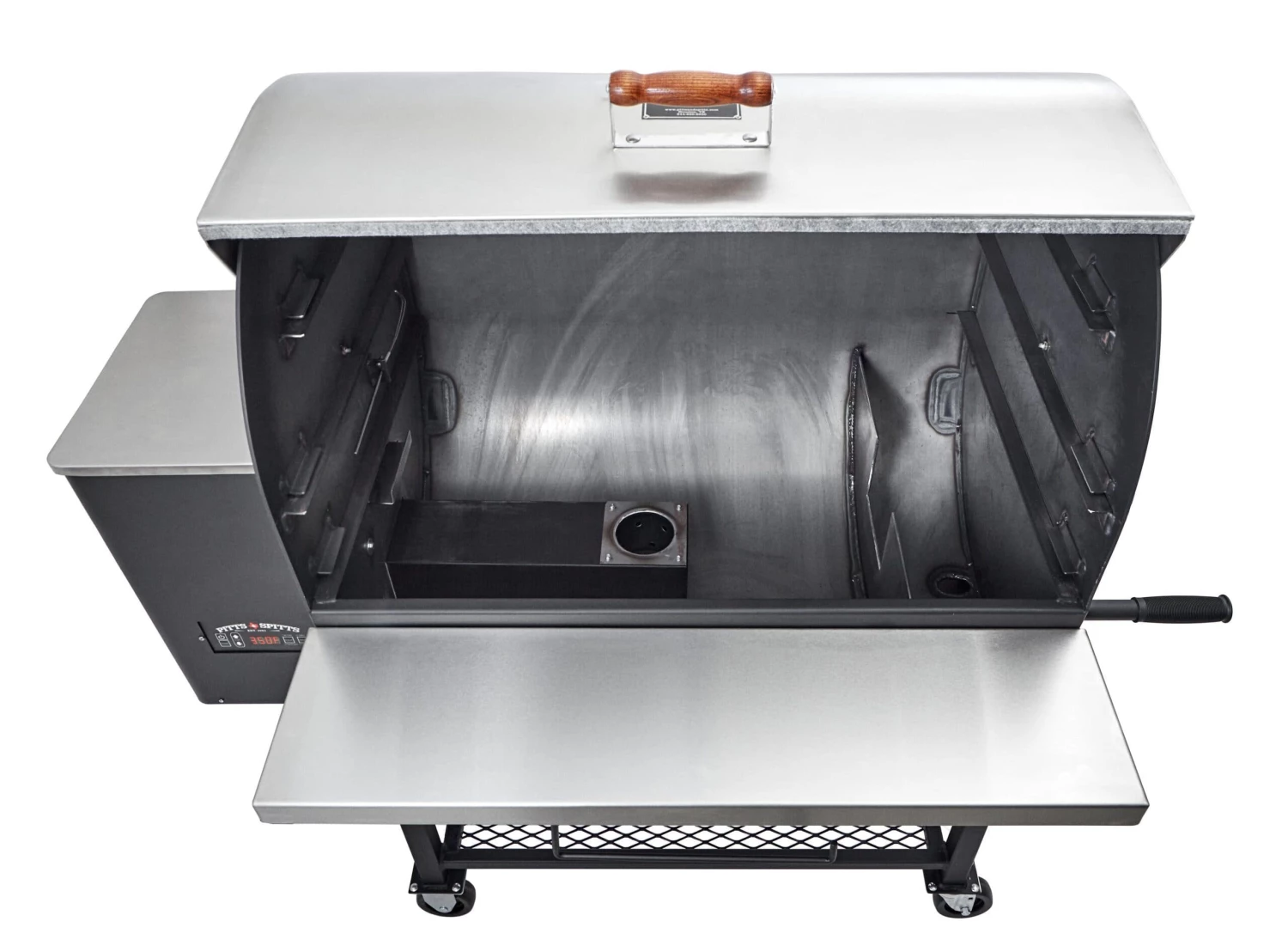 The carbon steel cooking chamber is made of 7 and 10 gauge carbon steel. This grill comes standard with our signature 304 stainless steel lid and work shelf.