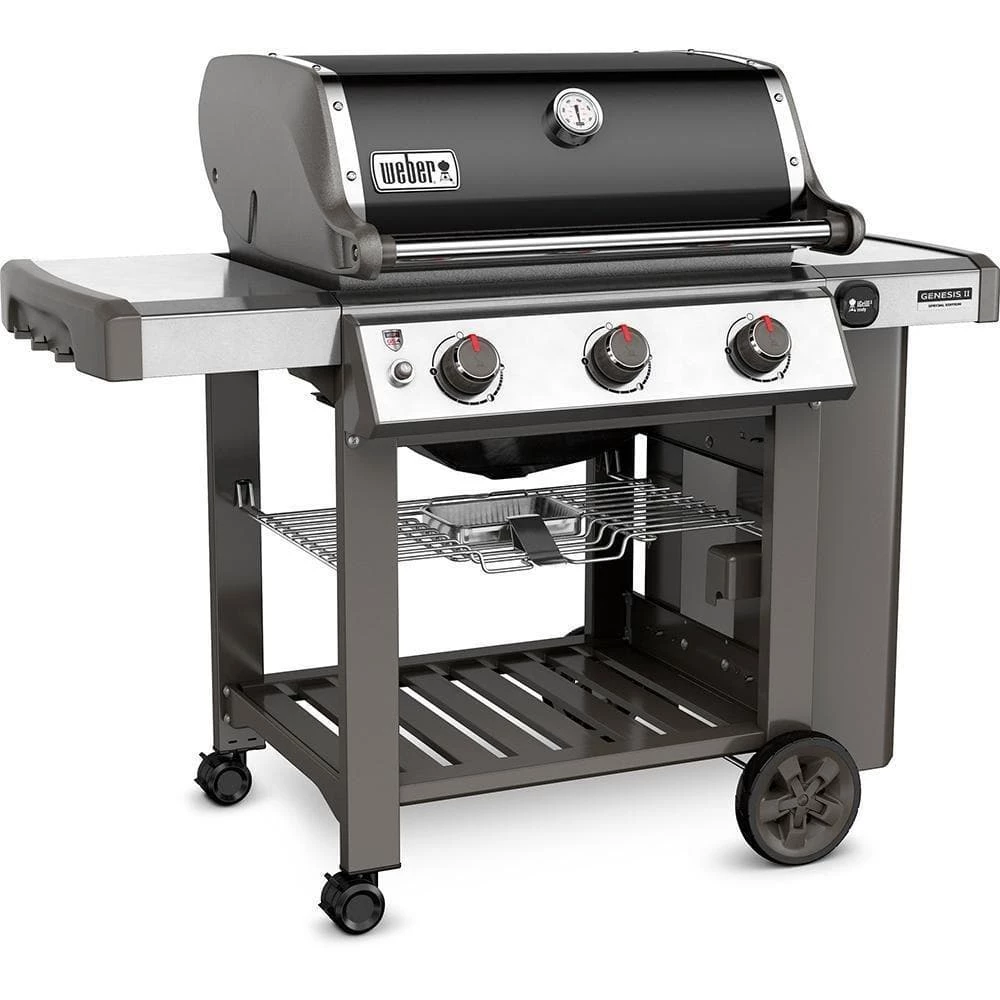 The Weber Genesis II Special Edition grill featuring a black porcelain-enameled finish, 9mm stainless steel rod cooking grates & motion-activated handle light