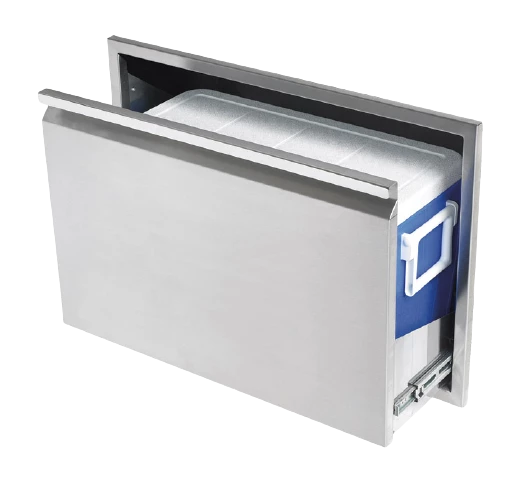 Twin Eagles convenient cooler drawer offers easy access to ice, cold beverages, or marinated foods in your outdoor kitchen – and tucks away to make room for chefs in action.