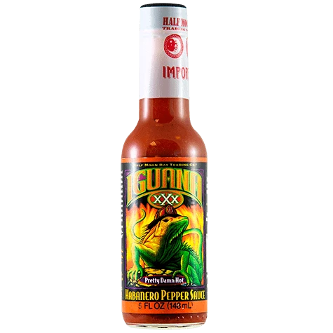 Iguana XXX Habanero Pepper Sauce is a hot, classically-styled sauce featuring a 50% aged Habanero base with carrot, onion, garlic, tomato, and lime juice rounding its full-bodied taste. The striking natural orange color comes from the dominant ripe Habanero and carrot base. Iguana XXX is not to be confused with ridiculously hot Habanero sauces that are fortified with pepper extracts. As the label says, this all-natural pepper sauce is “Pretty Damn Hot” without being artificially so. Made in Costa Rica