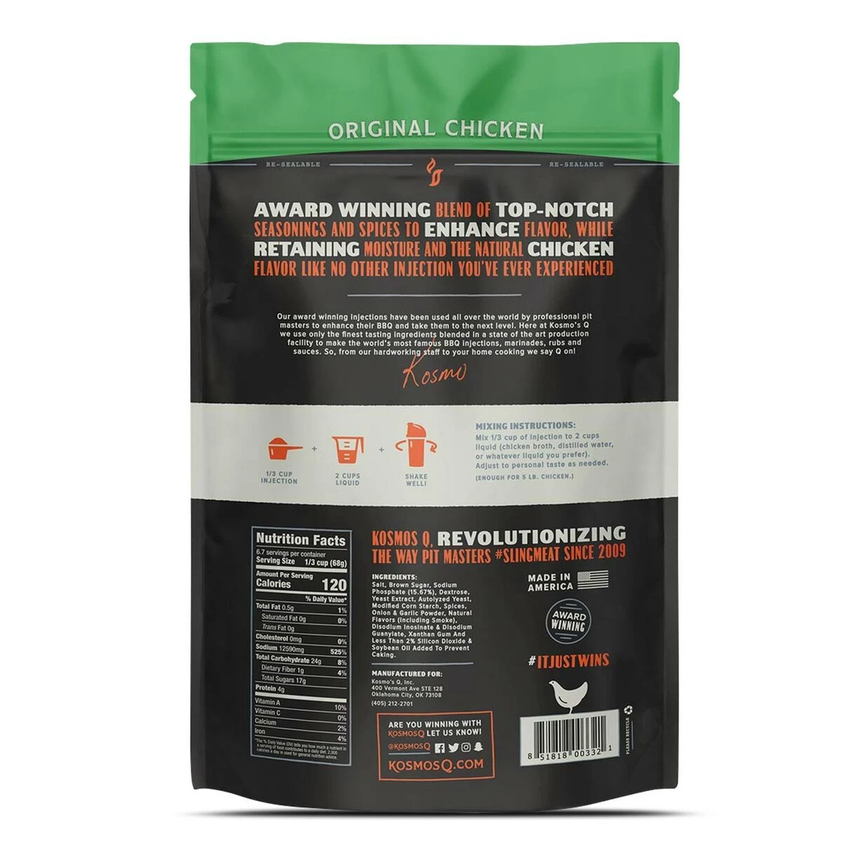 Kosmo’s Q’s combination of brown sugar, garlic, and a blend of smoky spices work together to create an injection providing your chicken both delicious flavor and moisture.