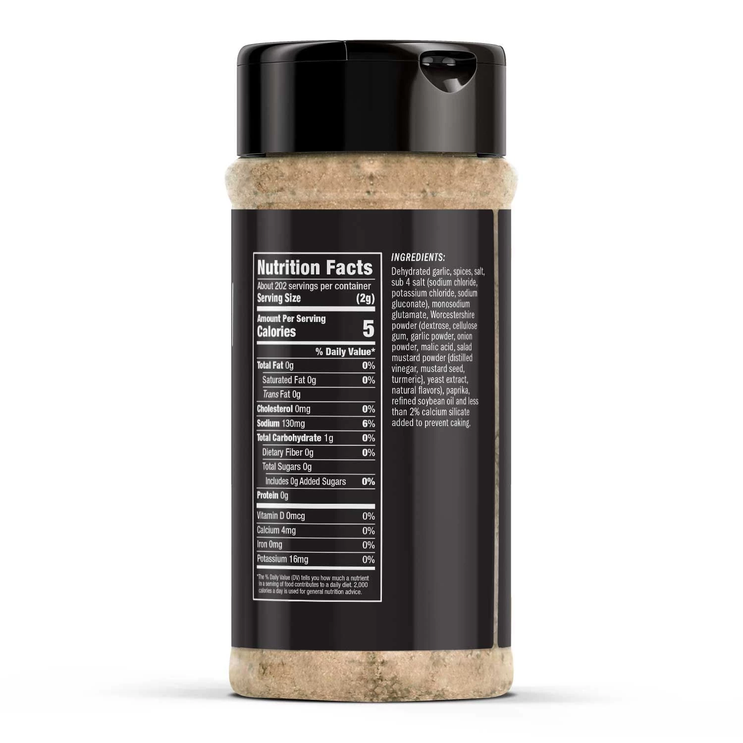 Ingredients: Dehydrated garlic, spices, salt, sub 4 salt (sodium chloride, potassium chloride, sodium gluconate), monosodium glutamate, Worcestershire powder (dextrose, cellulose gum, garlic powder, onion powder, malic acid, salad mustard powder {distilled vinegar, mustard seed, turmeric}, yeast extract, natural flavors), paprika, refined soybean oil and less than 2% calcium silicate added to prevent caking.