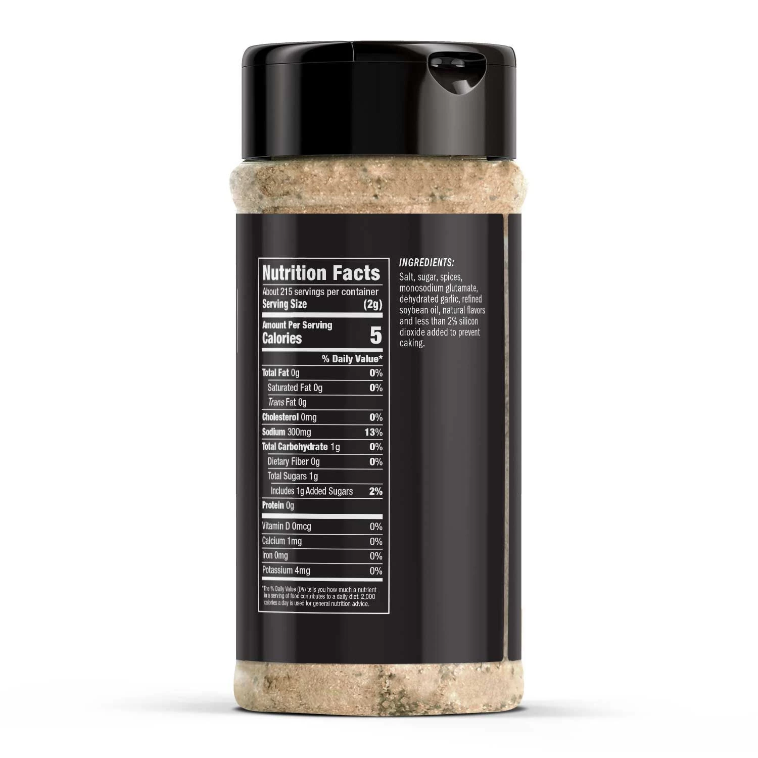 Salt, sugar, spices, monosodium glutamate, dehydrated garlic, refined soybean oil, natural flavors and less than 2% silicon dioxide added to prevent caking