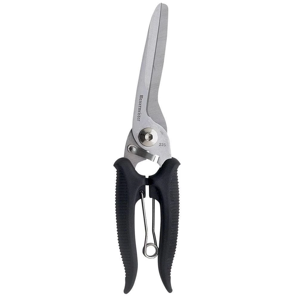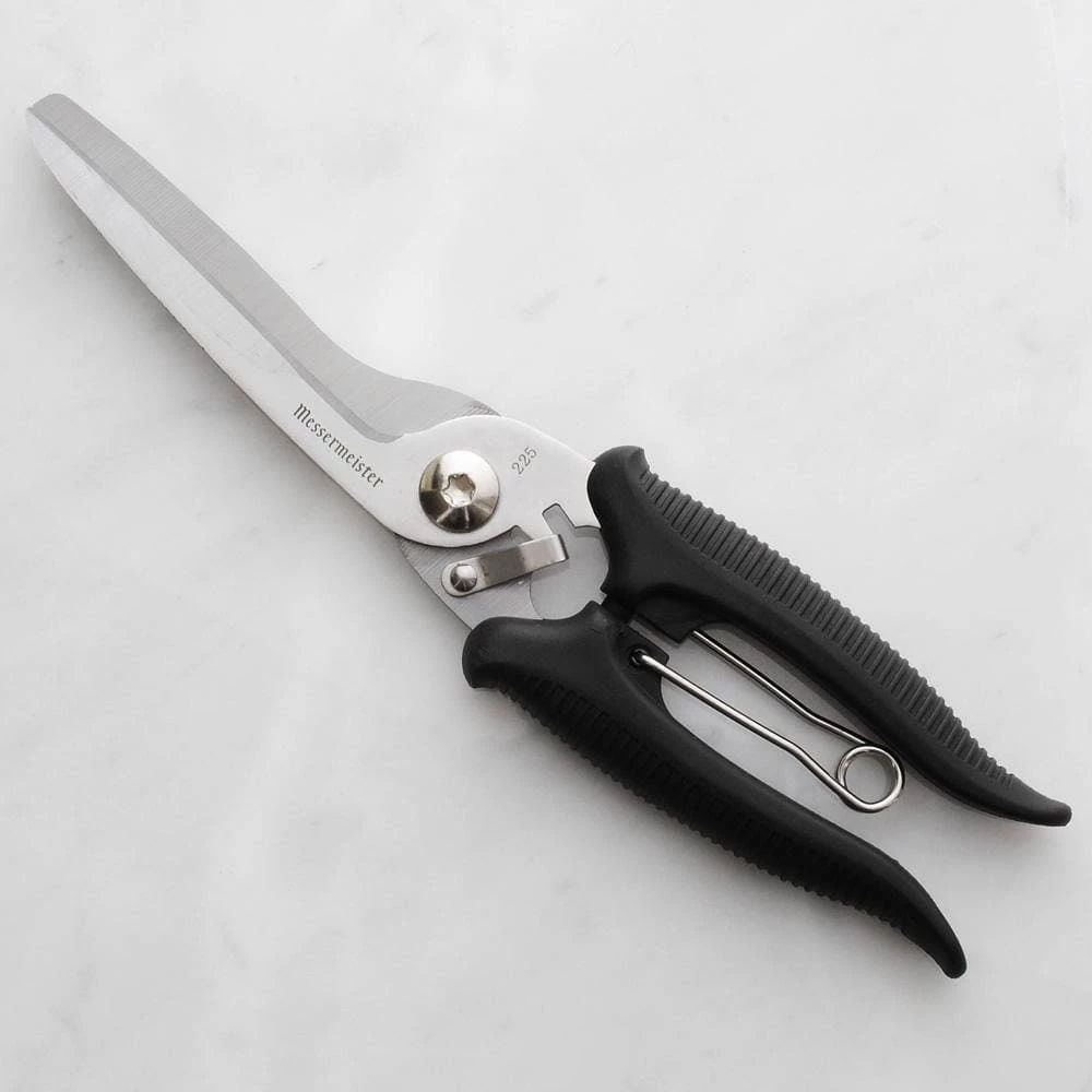 Messermeister kitchen scissors and shears are crafted from a high-quality stainless steel alloy with soft tactile polygrip stainless steel handles. The thin sharp blades will cut food, paper, string, plastic, and bones.