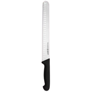Don’t be intimidated when you have a large roast to cut, the Messermeister Four Seasons Kullenschliff Wide Slicer has all the blades that you need for large cutting tasks. The commercial quality knife has a 2” wide long and slender stamped blade with a round tip. This style of the blade allows you to slice through large cuts of brisket, ham, or turkey with a singular motion without tearing or shredding. The alternating kullenschliffs (a.k.a. kullens, hollows, or grantons) on each side of the knife reduce drag and prevent items from sticking to the blade.