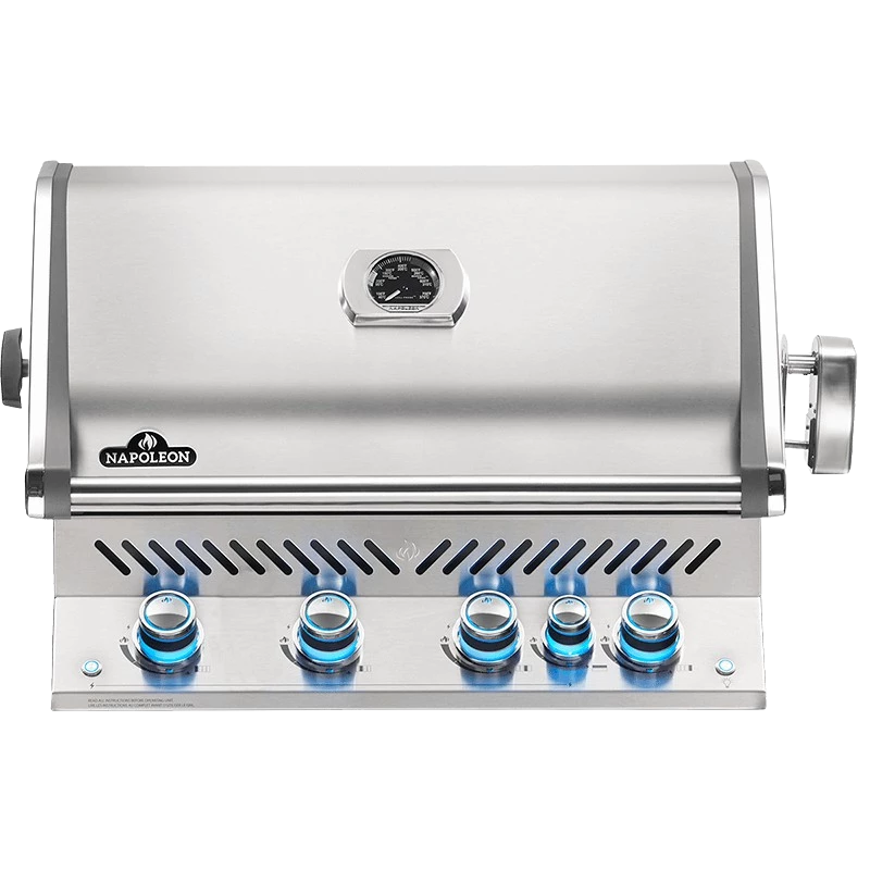 The Napoleon Prestige PRO 500 blends quality and performance into one package and has the features to make every cooking experience exceptional. This built-in natural gas grill has four stainless steel tube burners that provide up to 48,000 BTUs of cooking power. The grill has stainless steel cooking grates with 500 square inches of main cooking area and 260 square inches across the stainless steel warming area for a total of 760 square inches of cooking area. Easily turn the burners on with flame ignition for a reliable start-up. The stainless steel wave cooking grids create the trademark Napoleon sear lines. The stainless steel, self-cleaning sear plates vaporize drippings, control flare-ups, and keep your food moist. The Prestige PRO 500 also has an 18,000 BTU stainless steel rear infrared burner for slow cooking with the rotisserie kit. The hood features an Accu-Probe temperature gauge, stainless steel end caps and retains heat for oven-like performance. The LED Spectrum Night Light control knobs have near limitless color options making your nighttime entertaining a breeze, and they glow red when a burner is in use while two interior lights illuminate the grilling surface. A full-width drip pan also makes clean up a breeze. This Napoleon grill is manufactured in Canada.
