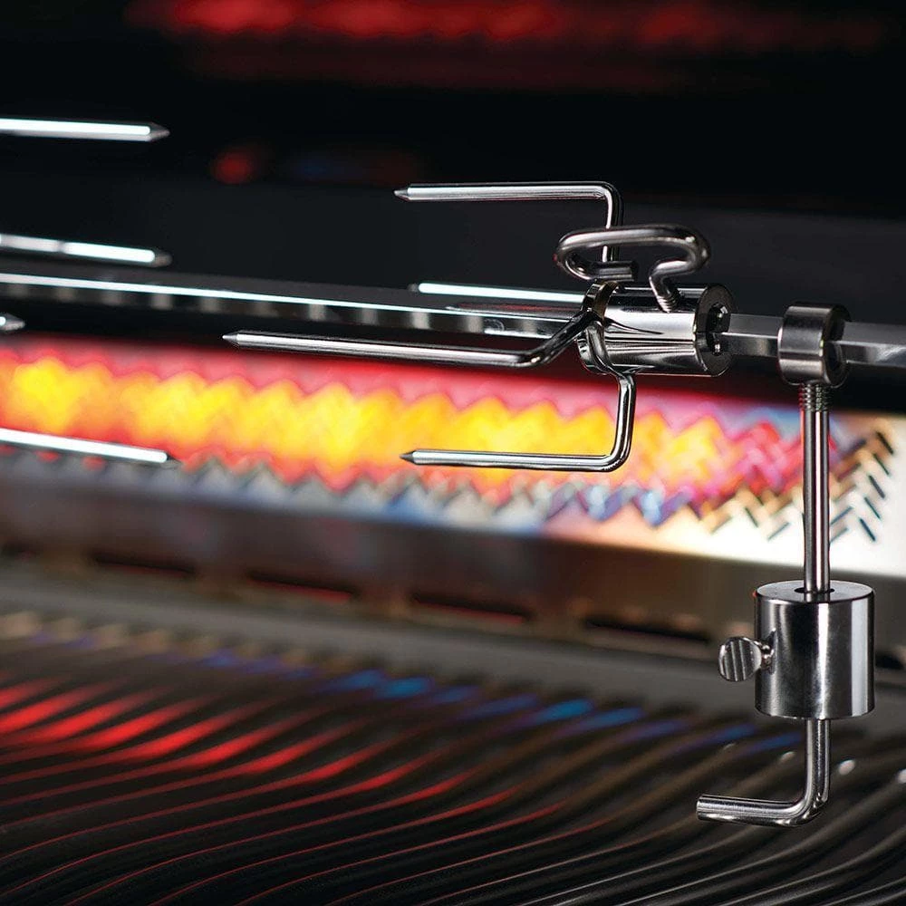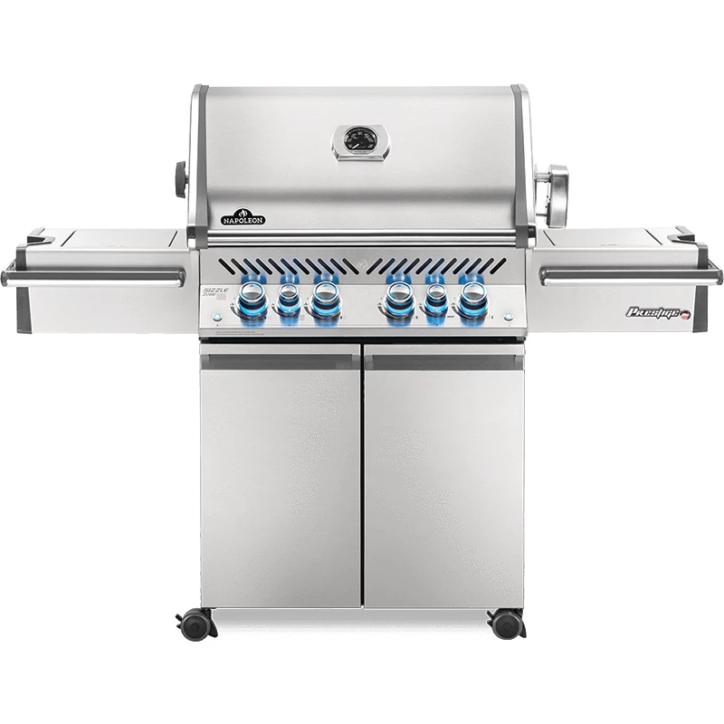 The Napoleon Prestige PRO 500 blends quality and performance into one package and has the features to make every cooking experience exceptional. This freestanding natural gas grill has four stainless steel tube burners that provide up to 48,000 BTUs of cooking power. The grill has stainless steel cooking grates with 500 square inches of main cooking area and 400 square inches of warming area for a total of 900 square inches of cooking area. Easily turn the burners on with flame ignition for a reliable start-up. The stainless steel wave cooking grids create the trademark Napoleon sear lines. The stainless steel, self-cleaning sear plates vaporize drippings, control flare-ups, and keep your food moist. The Prestige PRO 500 also has an 18,000 BTU stainless steel rear infrared burner for slow cooking with the rotisserie kit and a 14,000 BTU infrared side burner for searing meats. The hood features an Accu-Probe temperature gauge, stainless steel end caps and retains heat for oven-like performance. The LED Spectrum Night Light control knobs have near limitless color options making your nighttime entertaining a breeze, and they glow red when a burner is in use while two interior lights illuminate the grilling surface. A full-width drip pan also makes clean up a breeze. The stainless steel grill cart also features a built-in ice bucket and double doors with soft-close for storage and easy roll locking casters for moving the grill around. This Napoleon grill is manufactured in Canada.