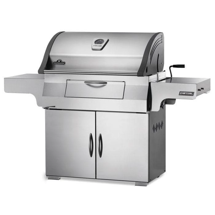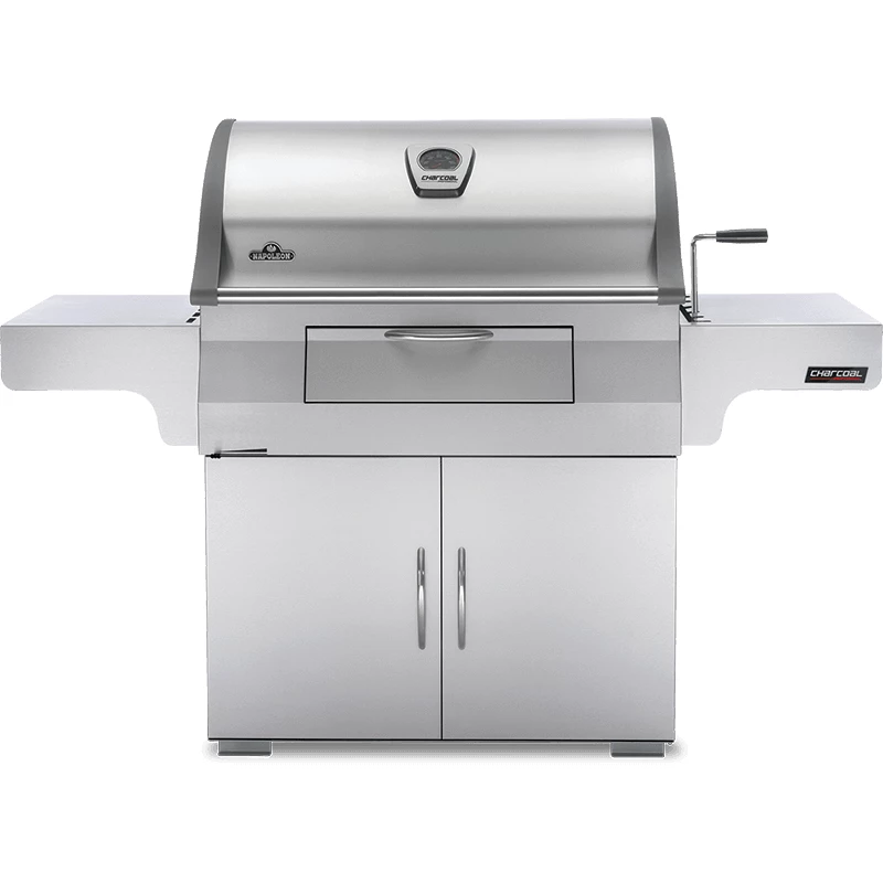 The Napoleon Charcoal Professional Grill takes traditional charcoal grilling to new heights with the stability and features of cart model gas grilling in a huge charcoal BBQ. Durable and beautiful stainless steel construction makes this charcoal grill ideal for every environment. You can add charcoal on the fly with the front-loading charcoal door. The adjustable charcoal bed and sliding air vents make heat management a breeze. Lower the charcoal bed for easy roasting, or raise it up for high heat searing. You’ll know it’s a Napoleon with the iconic WAVEâ„¢ cooking grids for those distinctive sear marks. The most unique feature of the Charcoal Professional has to be the charcoal-powered rotisserie burner. The slide-out ash and drip pan keeps cleanup simple. Experience the height of professional charcoal grilling with the Napoleon stainless steel Charcoal Professional Grill.