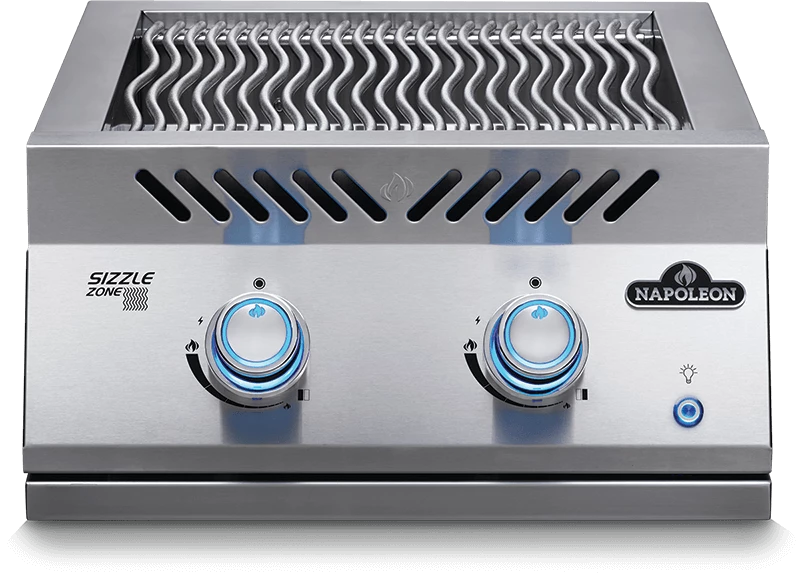 The Infrared SIZZLE ZONE™ can be used to produce the perfect sear on meat or used to create sides and sauces while the main grill is in use. This 18-inch, dual burner, drop-in Infrared SIZZLE ZONE™ burner provides loads of space to sear succulent steaks to restaurant-quality perfection. Made from the same quality of marine-grade stainless steel as the 700 Series built-in grills, this drop-in side burner matches your custom outdoor kitchen. These burners provide stylish longevity and were built with ease of install in mind. Virtually maintenance-free 7.5-mm cooking grids deliver the iconic WAVE™ sear marks that tell your meal was cooked on a Napoleon. Ignite the burners one-handed using the JETFIRE™ instant ignition system. The ergonomic NIGHTLIGHT™ control knobs which provide ambiance and safety, glowing a glorious blue and changing to red when burners are in use.