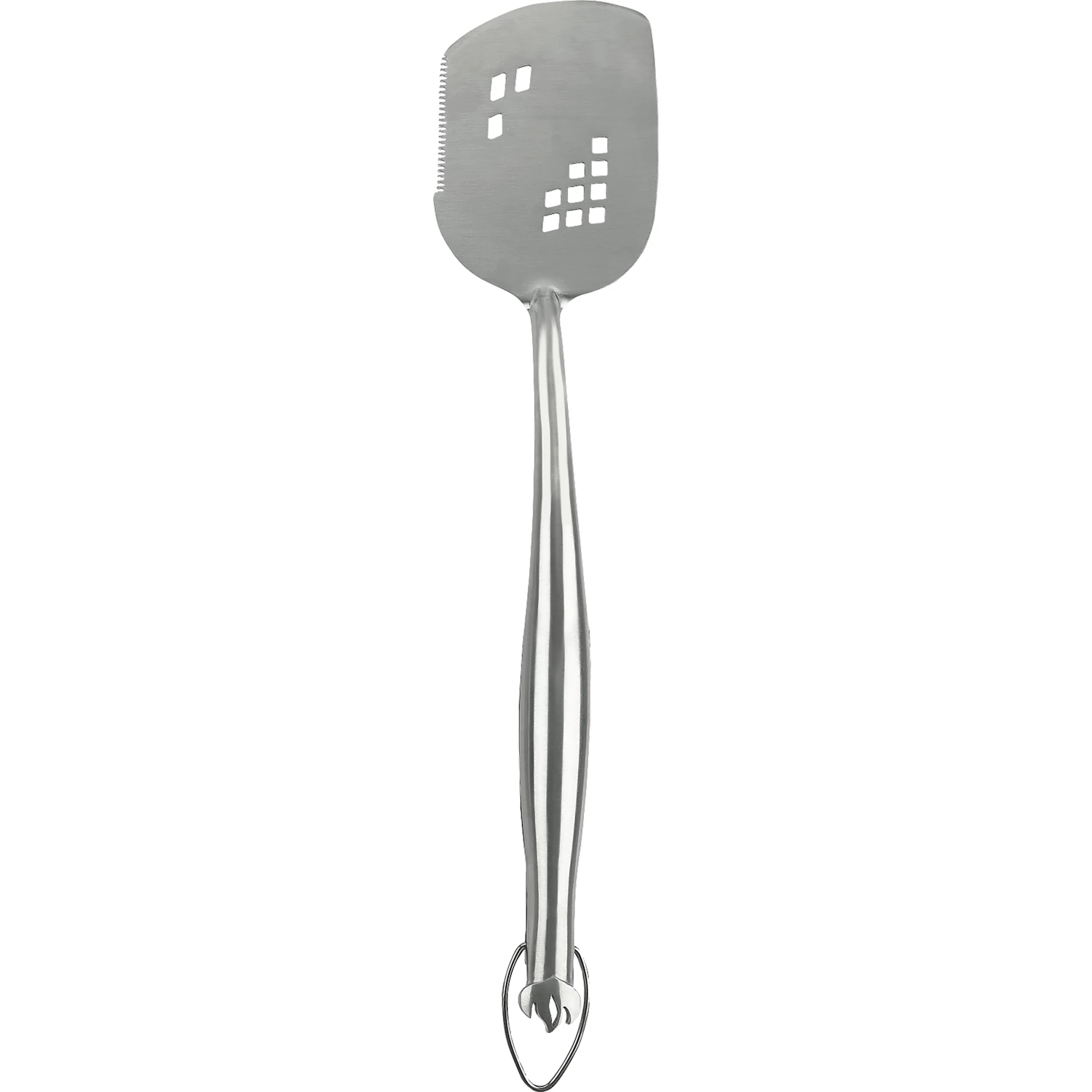 Napoleon PRO series stainless steel spatula with oversized head for firm control that will last. This oversized spatula is built to last, guaranteed not to rust even for the most frequent griller. Comes with a serrated edge for trimming the food right on the grill.