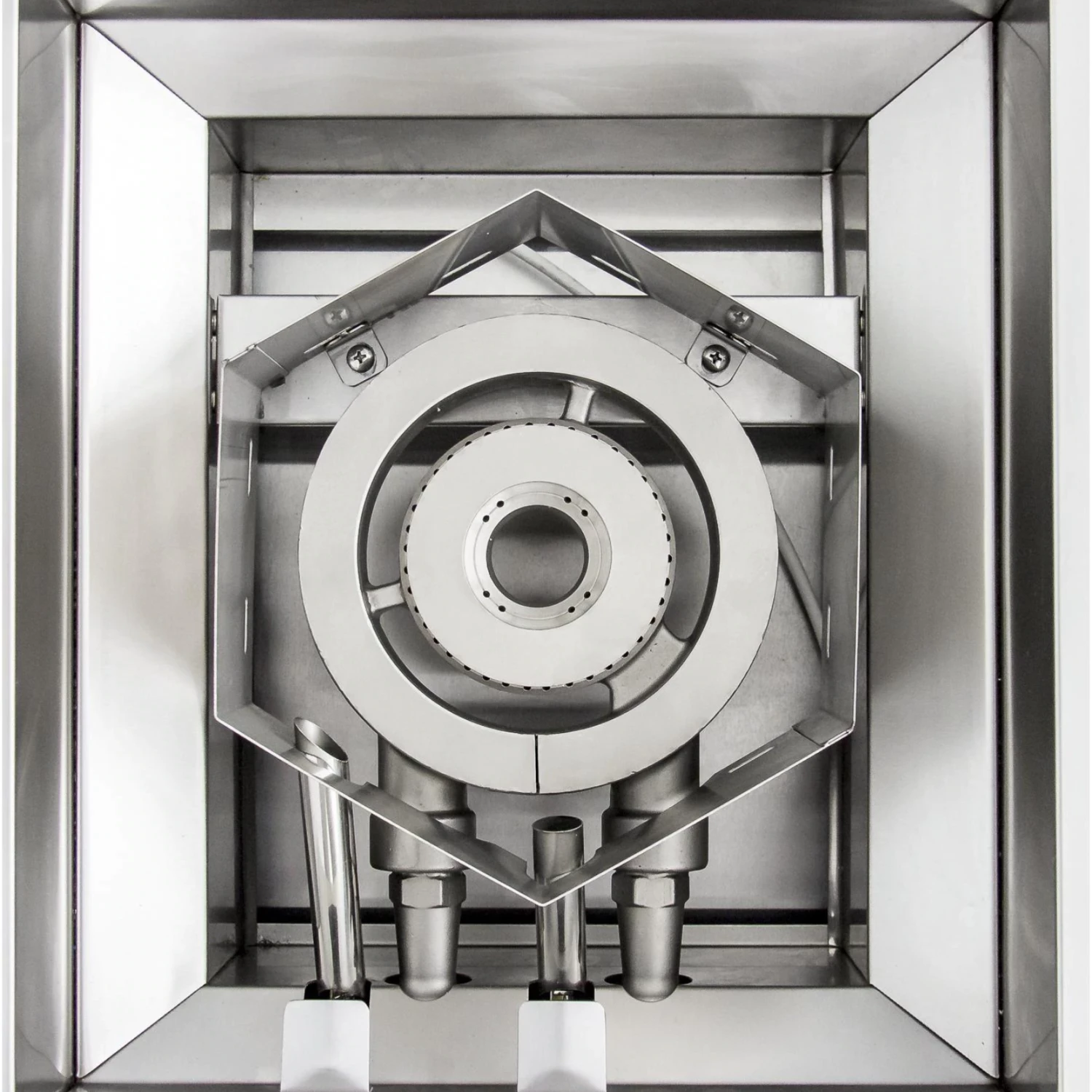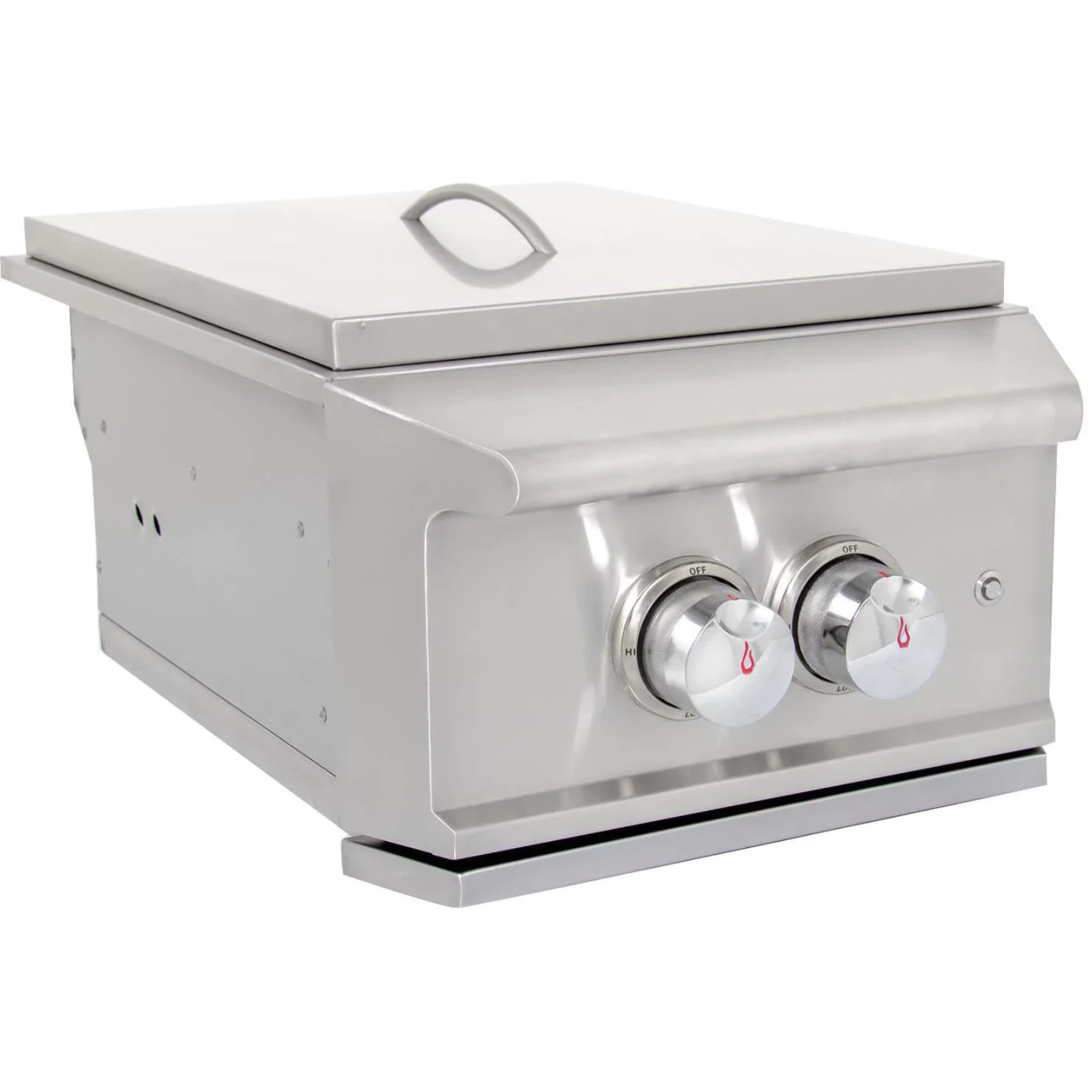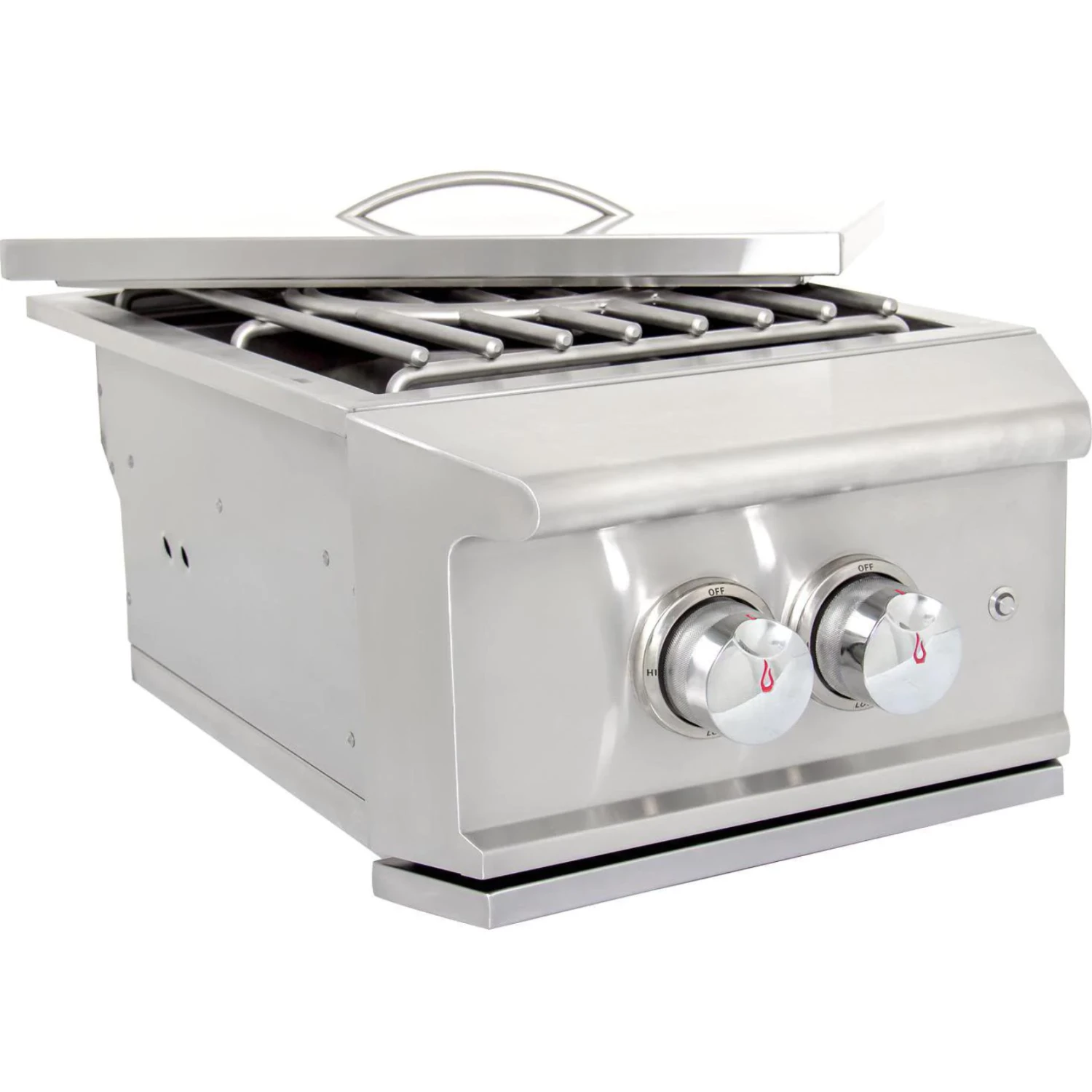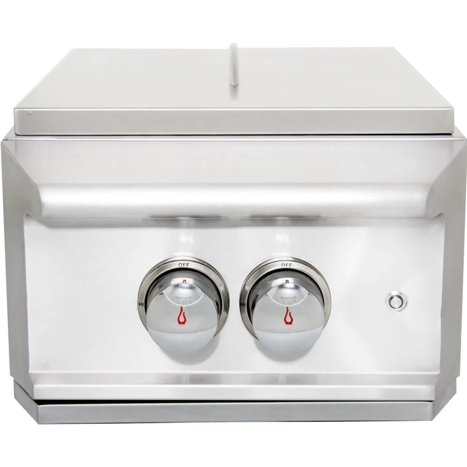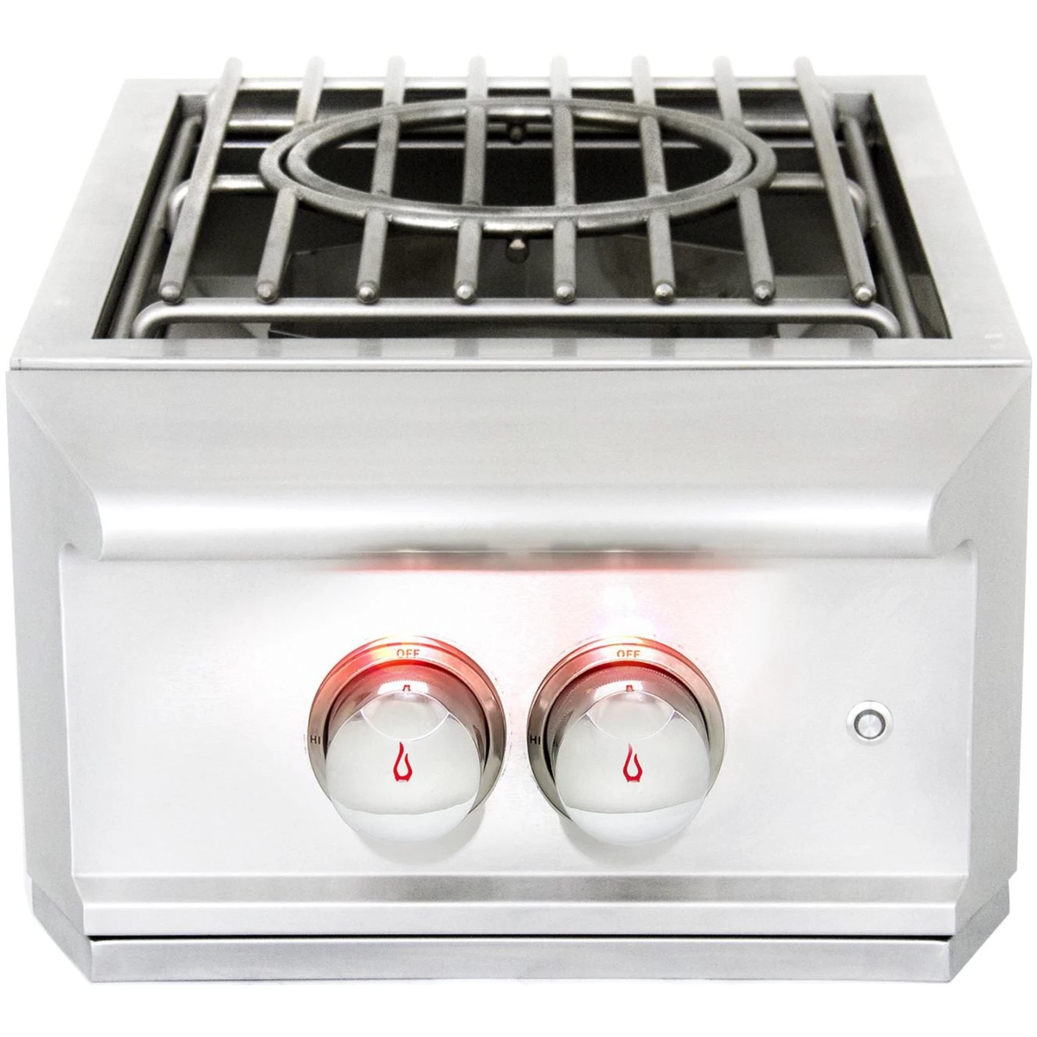 Introducing an affordable power burner that incorporates a narrow footprint and an efficient design which boils water in half the time as other power burners on the market. At 15 3/4 inches wide, the Blaze Professional LUX Power Burner gives you more room for additional components or more counter space for prepping and other tasks. Blaze power burners are made from stainless steel and include a removable stainless steel lid to protect the burner when not in use. The cooking grid is constructed from heavy-duty stainless steel rods with a removable 9-inch inner ring for cooking with a wok. Underneath the grid, a stainless steel guard surrounds the burner, which protects it from the wind and concentrates heat for maximum efficiency. This propane gas power burner features two, individually controllable burner rings. The inner ring is rated for 25,000 BTUs, and the outer ring is rated for 35,000 BTUs. The burners are lit with a simple push and turn the ignition. This dual ring design is ideal for cooking versatility. The inner burner is great for simmering sauces, or use both burners when boiling shrimp or frying fish. Cooking with the outer ring is perfect for large skillets and pans, as the high heat allows the pan to heat up quickly. The burner ring is made from commercial quality, 304 casts stainless steel for longevity. This power burner also sports red LED control knob illumination for cooking and entertaining at night. If you are looking for an affordable power burner so you have more in your budget for other components, Blaze power burners are a great solution. A power transformer is included for the lights.