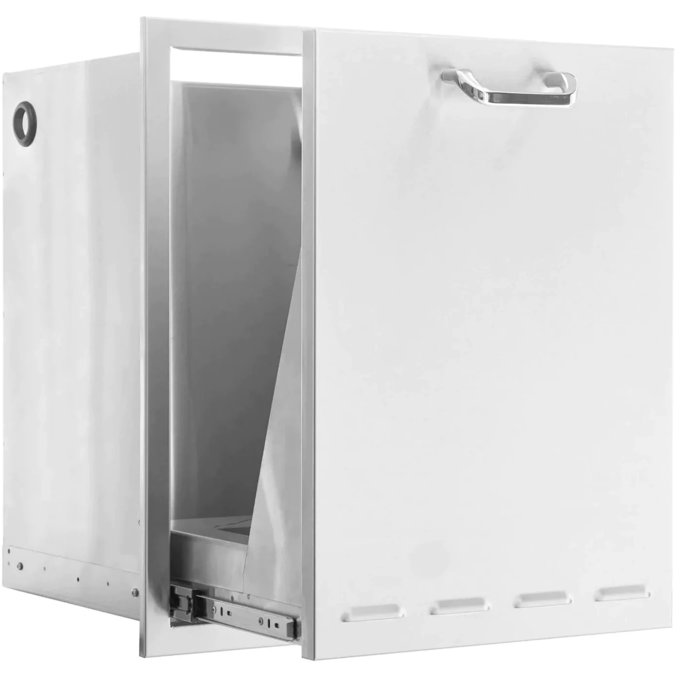 The PCM 260 Series 20″ stainless steel roll-out trash or propane tank drawer is constructed with a 20 gauge 304 stainless steel frame and number 4 brushed finish. The roll-out tray uses heavy-duty, commercial-grade ball-bearing drawer glides with full-length tracks for easy opening and closing and is flush mounted for a streamlined appearance. A 42-quart trash bin is also included. The Traditional handles require installation on this unit.