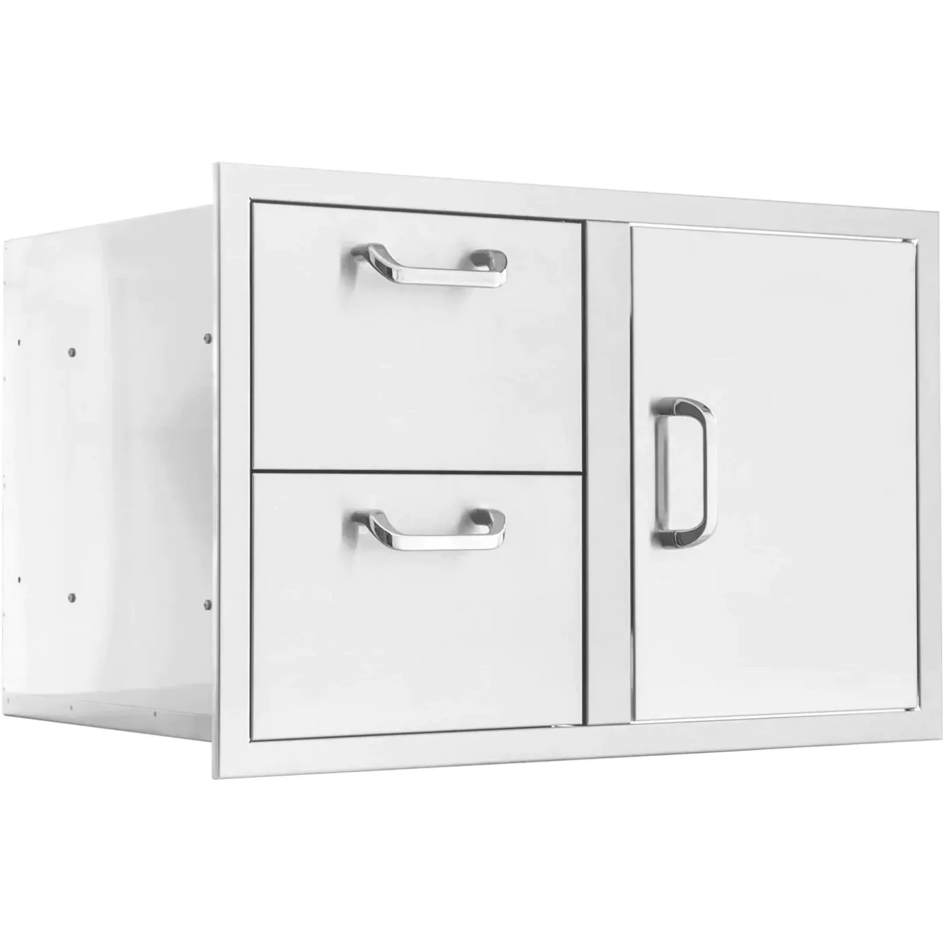 The PCM 260 Series 32-Inch stainless steel reversible access door & double drawer combo is constructed with a 20 gauge 304 stainless steel frame and number 4 brushed finish. The double-lined door adds structural integrity and the drawers use heavy-duty, commercial-grade ball bearings that glide on full-length drawer tracks for easy opening and closing. Flush mounted for a streamlined appearance, this access door and drawer combo is the perfect outdoor kitchen accessory for any outdoor BBQ island, providing storage space and access to the underside of grills and side burners. The Traditional handles require installation on this access door & double drawer combo.