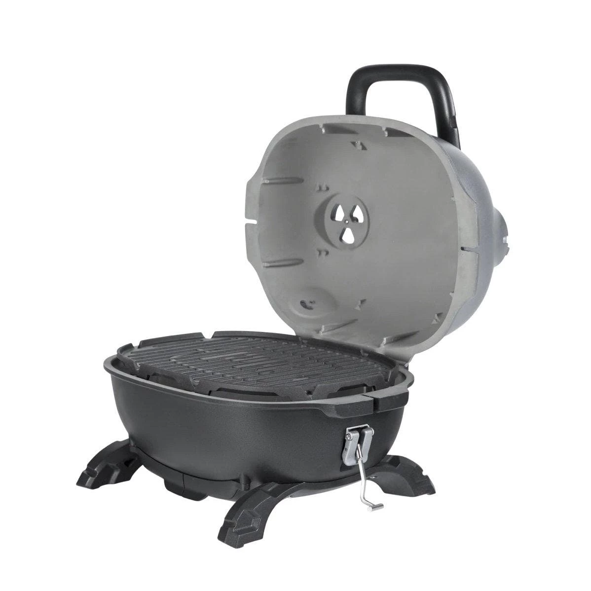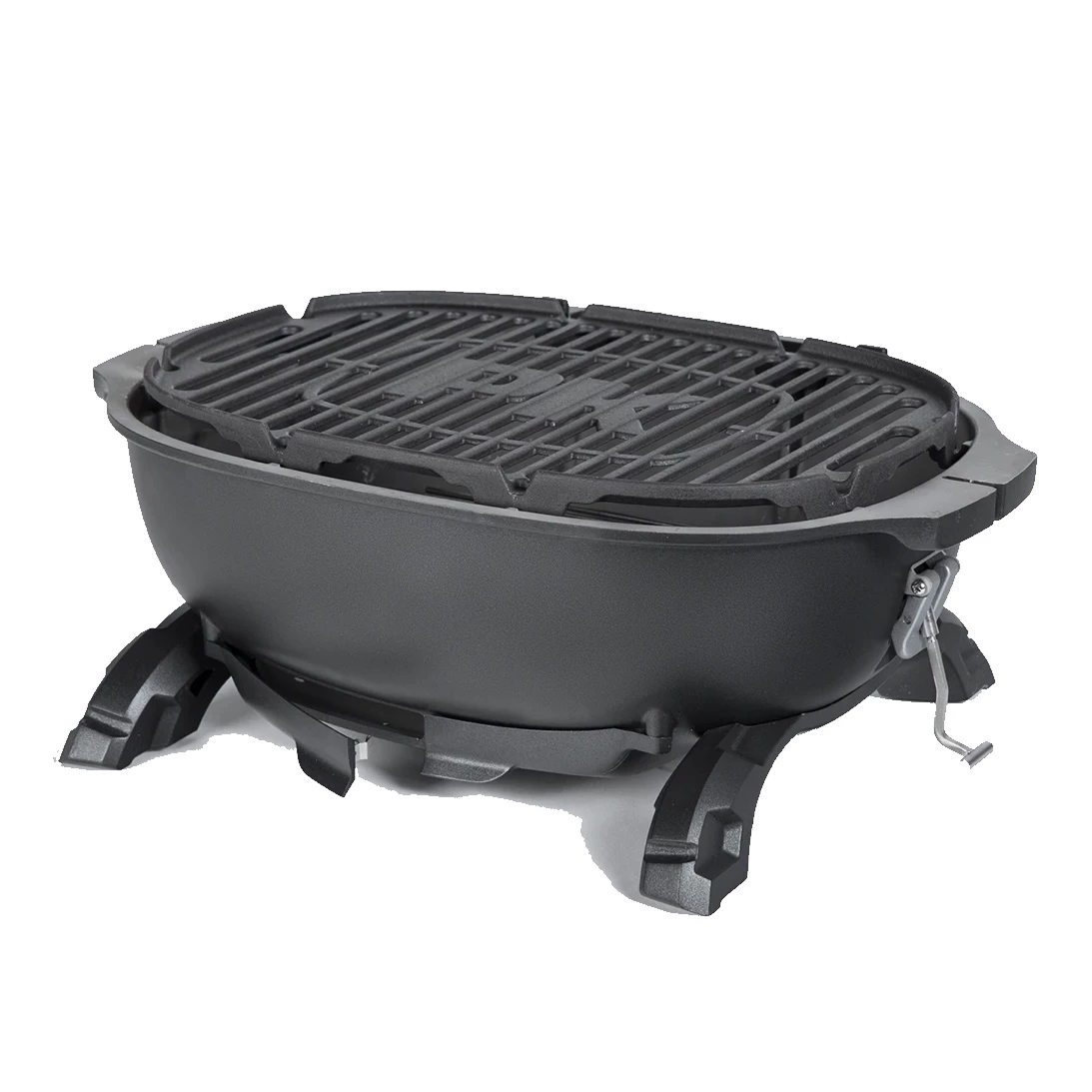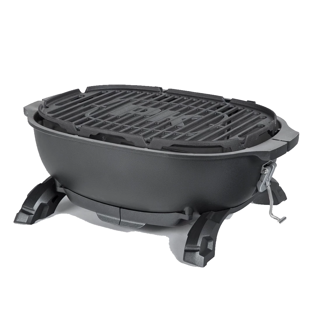 - Molded cradle, charcoal grate, cast iron cooking surface