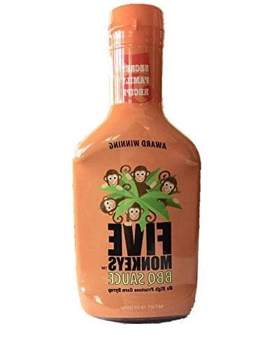 Original Five Monkeys BBQ Sauce is a secret family recipe now made available to the public. This sauce is the perfect blend of sweet and spicy flavors which allows it to pair with virtually everything. LOW SODIUM, NO HIGH FRUCTOSE CORN SYRUP!