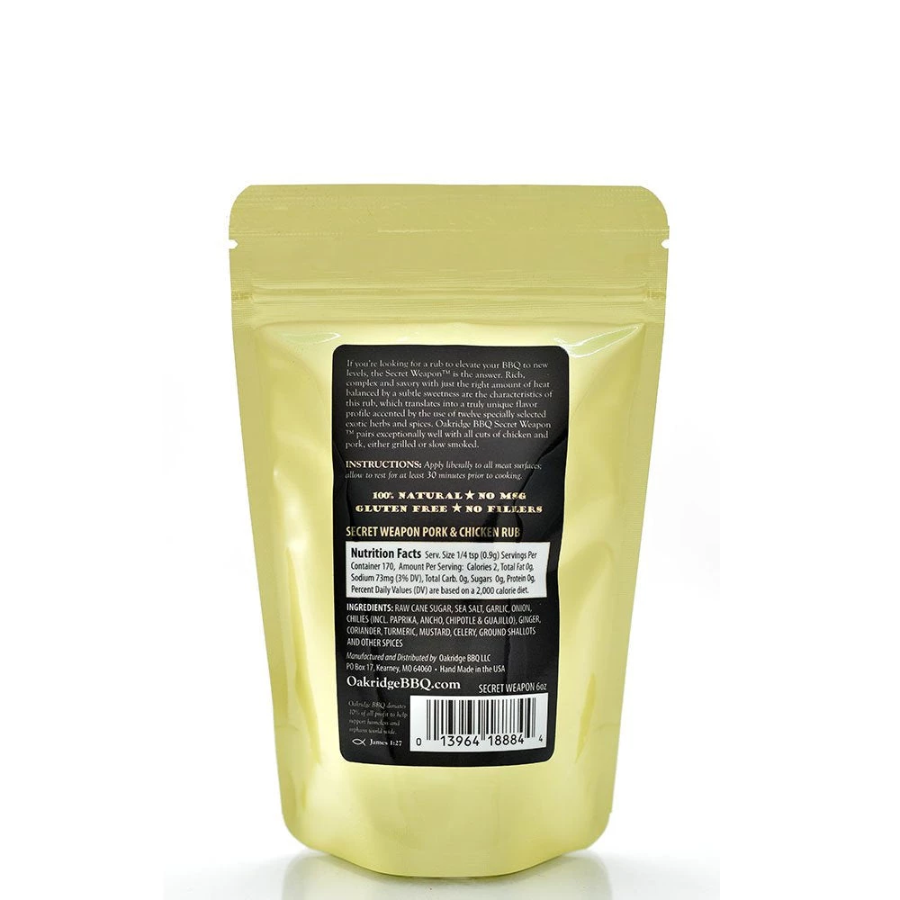 Oakridge BBQ Secret Weapon Pork & Chicken Rub – Introducing our new Competition Pork and Chicken Rub! We’ve called it Secret Weapon for a reason, if you’re looking for a totally unique flavor profile to elevate your barbecue to a new level, the Secret Weapon is your answer. Rich, complex and savory with just the right amount of heat balanced by a touch of sweetness are the hallmarks of this rub. This translates into a totally unique flavor profile from the use of twelve specially selected exotic herbs and spices. This All-Natural rub pairs exceptionally well with all cuts of chicken and pork, either grilled hot & fast or smoked slow & low