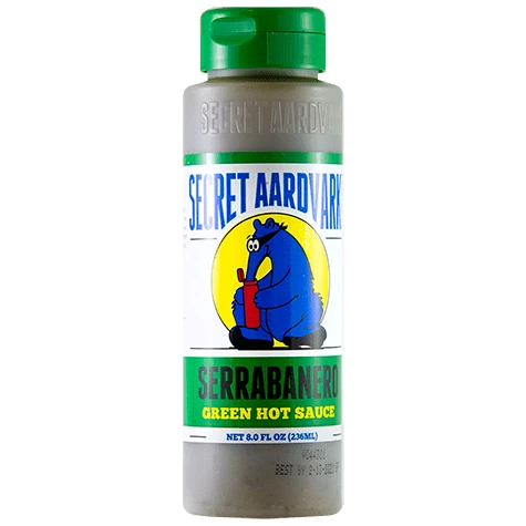 Secret Aardvark Serrabanero Green Hot Sauce Combines serrano and habanero chili with tomatillos, green tomatoes, and spices to get the mythical flavor of Serrabanero. It is a tad spicier than you might expect for a green hot sauce but not at the expense of flavor. Serrabanero is not a Verde sauce. We call it an American green. Put it on anything where you crave heat with a tang.