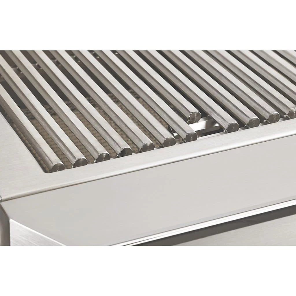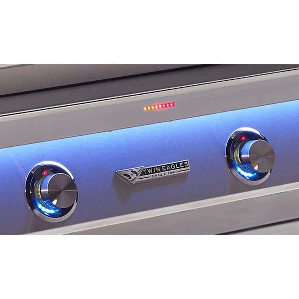 The Eagle One Series combines luxury grilling innovations found in Twin Eagles C Series gas grills with all-new, exclusive features to create a super premium grilling experience. The Eagle One Series stands out from the crowd with an array of functional illumination upgrades, including continuous ambient control panel lighting in an attractive indigo blue. New Exact Control Illumination features a single LED above each burner control knob that changes color based on feedback from dedicated burner temperature sensors, indicating when each burner reaches warm, hot, and searing temperatures. A TempTrack Illumination gauge above the control panel displays average overall grill temperature using a graduated series of LEDs, making it easy to know when your grill is ready for searing or when it has cooled enough to apply a grill cover after use. A concealed infrared rotisserie burner sits behind a black glass pane, allowing for a wider range of cooking temperatures and more evenly distributed heat across larger foods. Eagle One Series grills also have extra-large, 1/2-inch diameter hexagonal cooking grate rods for improved heat retention and extra food-to-surface contact. All metal components are made using premium-grade stainless steel with seamless heli-arc welded construction for maximum strength and durability. The double-lined hood with hidden heavy-duty lift extension springs provides better durability, more insulation, and reduces the weight to make it easier for you to open and close. The exclusive Control Illumination control knobs feature highly visible, graduated indigo blue LED markers and a control indicator notch that illuminates to precisely indicate current settings. This 36-inch grill has two 25,000 BTU, 14 gauge 304 grade stainless steel main burners with zone dividers, letting you independently control the heat, one 25,000 BTU infrared sear burner, and high-quality ceramic briquette flame tamers that distribute the radiant heat more evenly across the cooking surface. The two-position heavy-duty rotisserie system has a fully integrated motor with 100 pounds turning capacity and a chain-driven design providing consistent and uniform rotation of the rotisserie rod. The rotisserie rod conveniently stores in the drip tray handle when not in use. This grill has a reliable hot surface ignition, interior lights with a hood-activated light switch for nighttime grilling, a three-position warming rack that conveniently stows away when not in use, and a large capacity sealed smoker box. Twin Eagles products are designed and manufactured in the USA with pride.