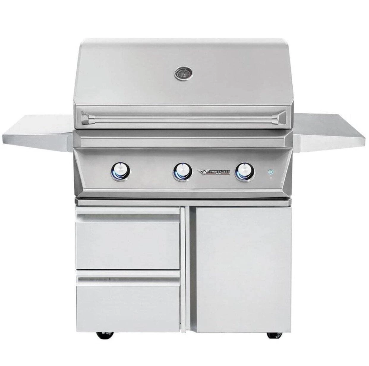 Twin Eagles has mastered the secret sauce in grilling perfection with their innovative Five-Part Grilling System that is designed for the ultimate grilling synergy. Twin Eagles gas grills feature premium-grade stainless steel with seamless heli-arc welded construction for maximum strength and durability. The double-lined hood with hidden heavy-duty lift extension springs provides better durability, more insulation, and reduces the weight to make it easier for you to open and close. The Exclusive Control Illumination control knobs feature a highly visible, graduated indigo blue line and a control indicator notch that illuminates to give a precise control setting. This 36-inch grill has two (2) 25,000 BTU 14 gauge 304-grade stainless steel main burners with zone dividers letting you independently control the heat, one (1) 25,000 BTU infrared sear burner, and high-quality ceramic briquette flame tamers that distribute the radiant heat more evenly across the cooking surface. The 3/8 inch stainless steel hexagonal cooking grates offer more food-to-surface contact and allow more heat to be conducted into your food generating deeper and thicker restaurant-style sear marks. The two-position heavy-duty rotisserie system has a fully integrated infrared rotisserie burner and motor with 100 pounds turning capacity and a chain-driven design providing consistent and uniform rotation of the rotisserie rod. The rotisserie rod conveniently stores in the drip tray handle when not in use. This grill has a reliable hot surface ignition, interior lights with a hood-activated light switch for nighttime grilling, a three-position warming rack that conveniently stows away when not in use, and a large capacity sealed smoker box. Twin Eagles offers several unique features that together deliver unparalleled performance. Twin Eagles products are designed and manufactured in the USA with pride.