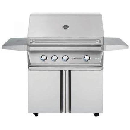 Compatible with any 36″ built-in grill. This integrated grill base offers portability and a freestanding option compatible with our 36″ built-in grills. Standard features include soft-closing doors and self-latching drawers, fold-down side shelves with tool holders, and heavy-duty casters with front brakes for easy maneuverability and locking. The convenient pull-out tray inside holds a trash receptacle or LP tank. Access doors feature flush handle design with high-polished accents.