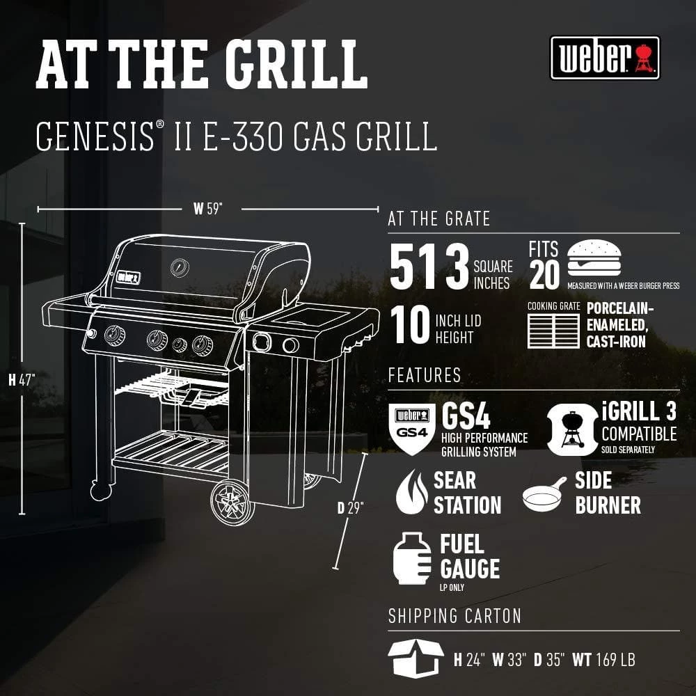 Four bold colors, unmatched grilling performance, and upgraded features, such as a sear station and side burner, are what make the Genesis II E-330 your grill of choice. Backed by a 10-year warranty on all parts of the grill and a lifetime of customer support, your search for the ideal grill ends here. It’s equipped with premium features that include porcelain-enameled, cast-iron cooking grates that are easy to clean and durable. The open-cart design provides convenient access to grilling tools so that everything you need is within arm’s reach. And the Tuck-Away warming rack keeps food warm and folds for easy storage.